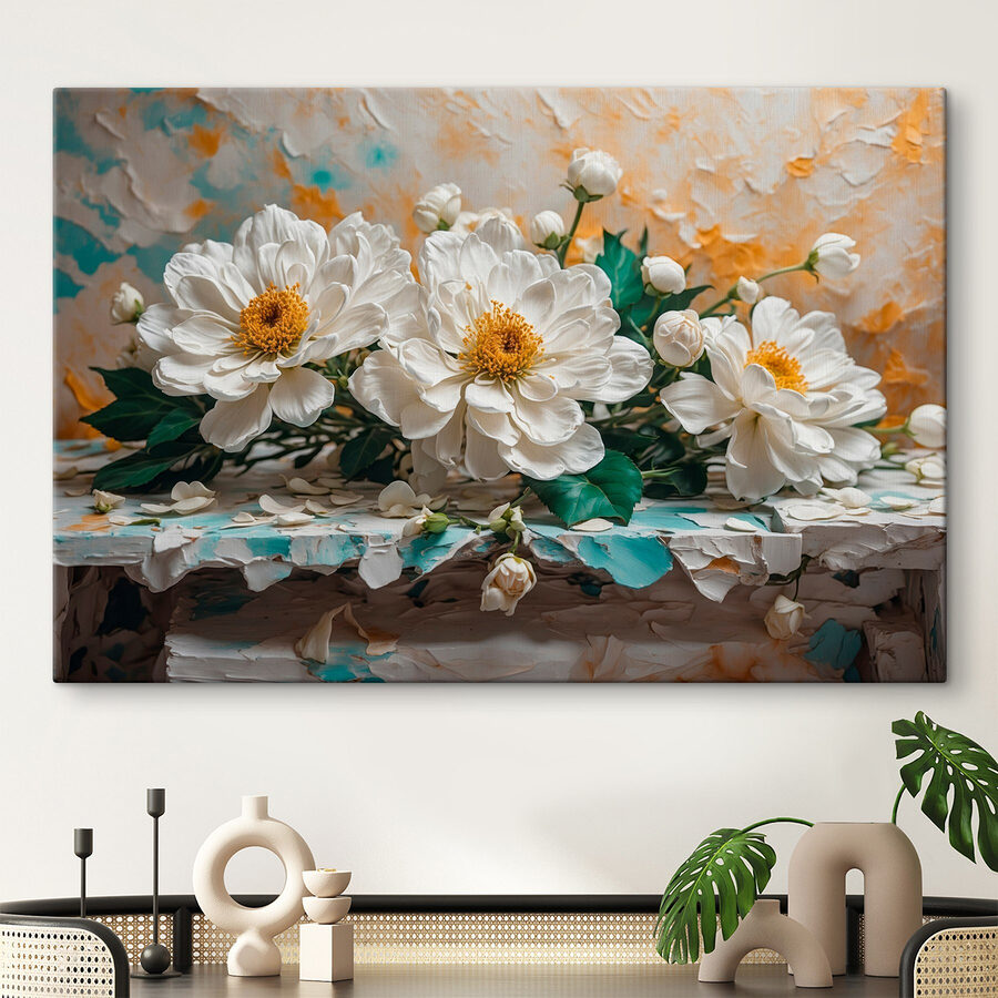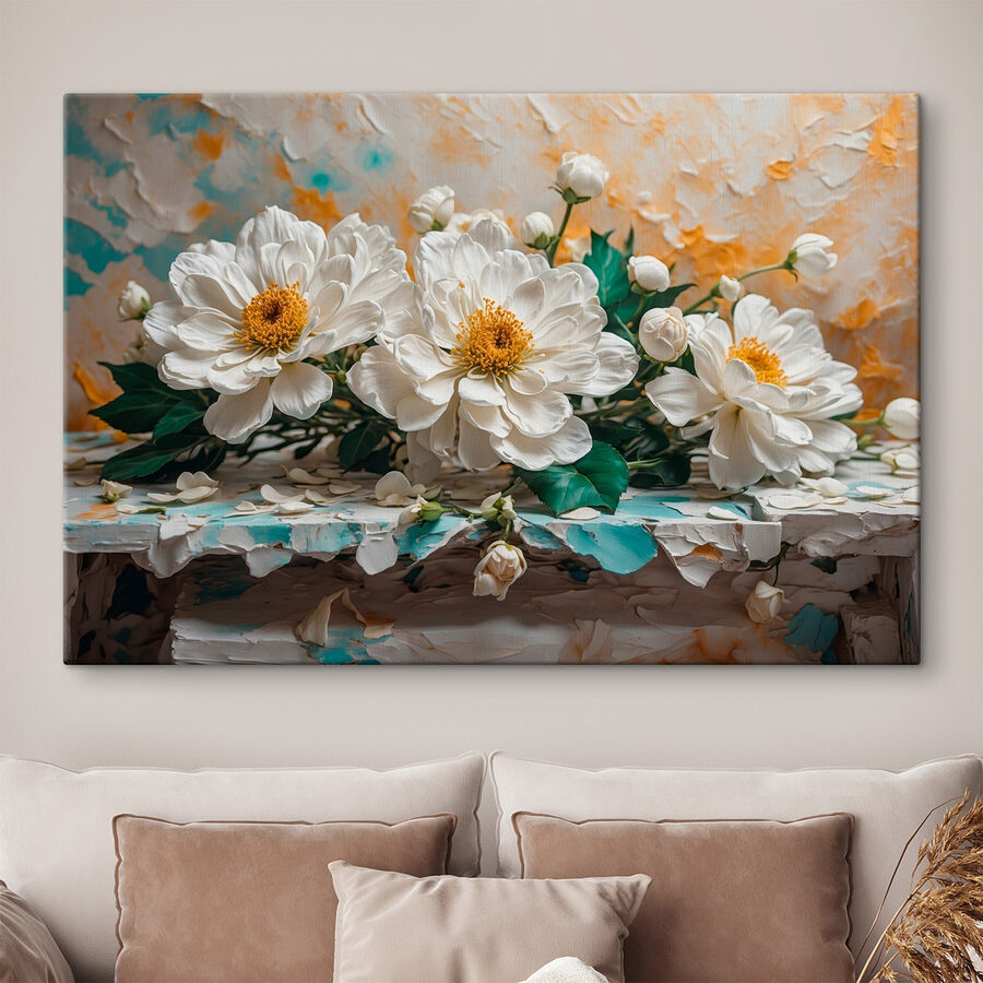 Verschönern Sie jeden Raum mit diesem hübschen Leinwanddruck, der eine Gruppe weißer Blumen zeigt. Er bringt ein Gefühl von Ruhe und frischer Luft an Ihre Wände. Stellen Sie sich vor, Sie betreten einen Raum und fühlen sich, als wären Sie gerade in einen ruhigen Garten getreten – weiche Blütenblätter und sanfte Farben flüstern Entspannung.