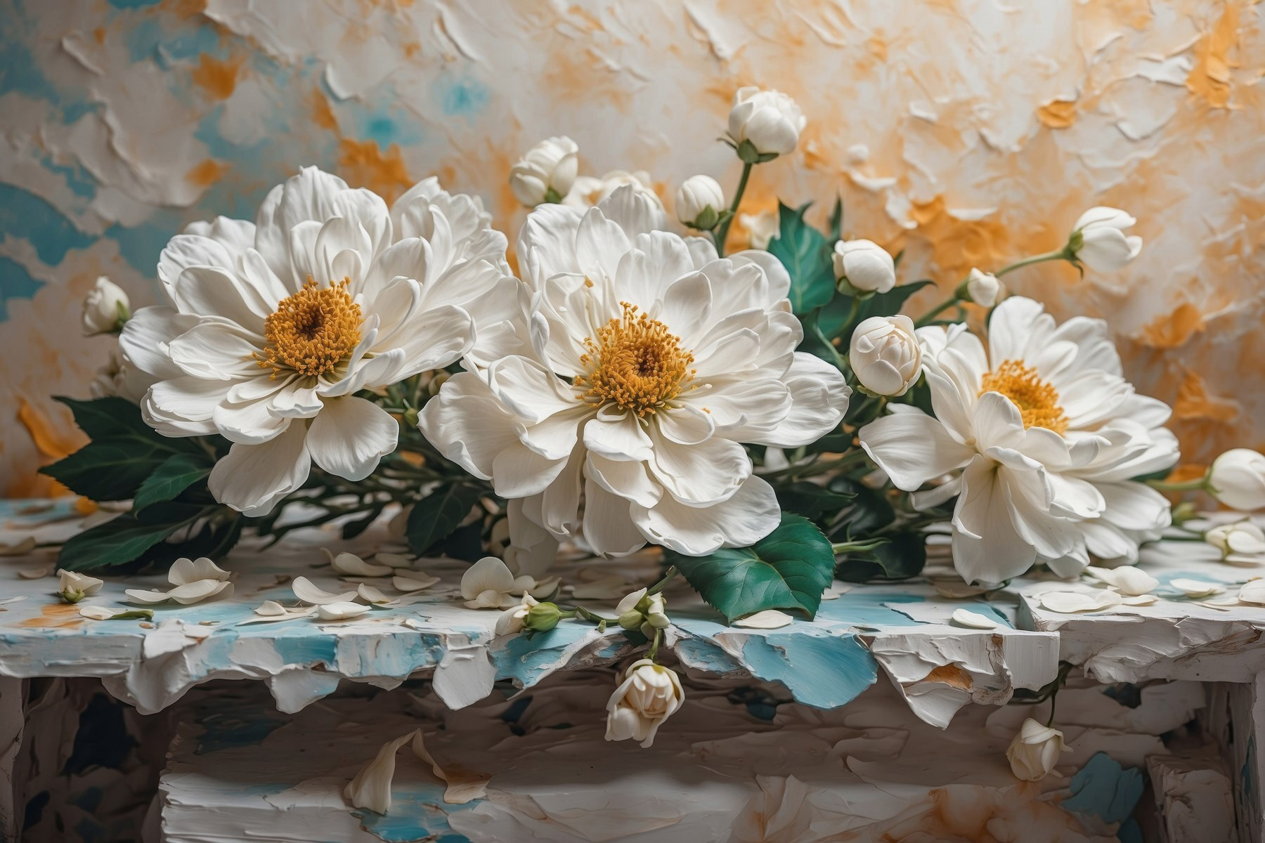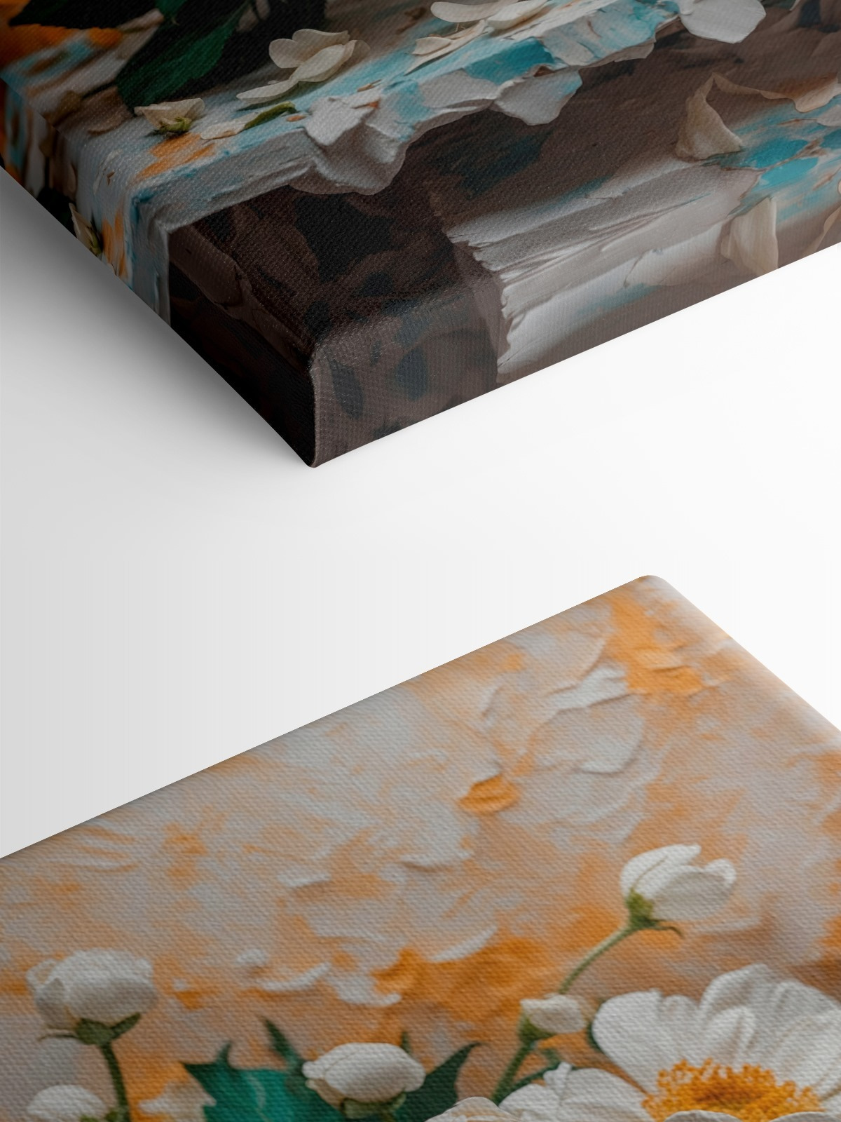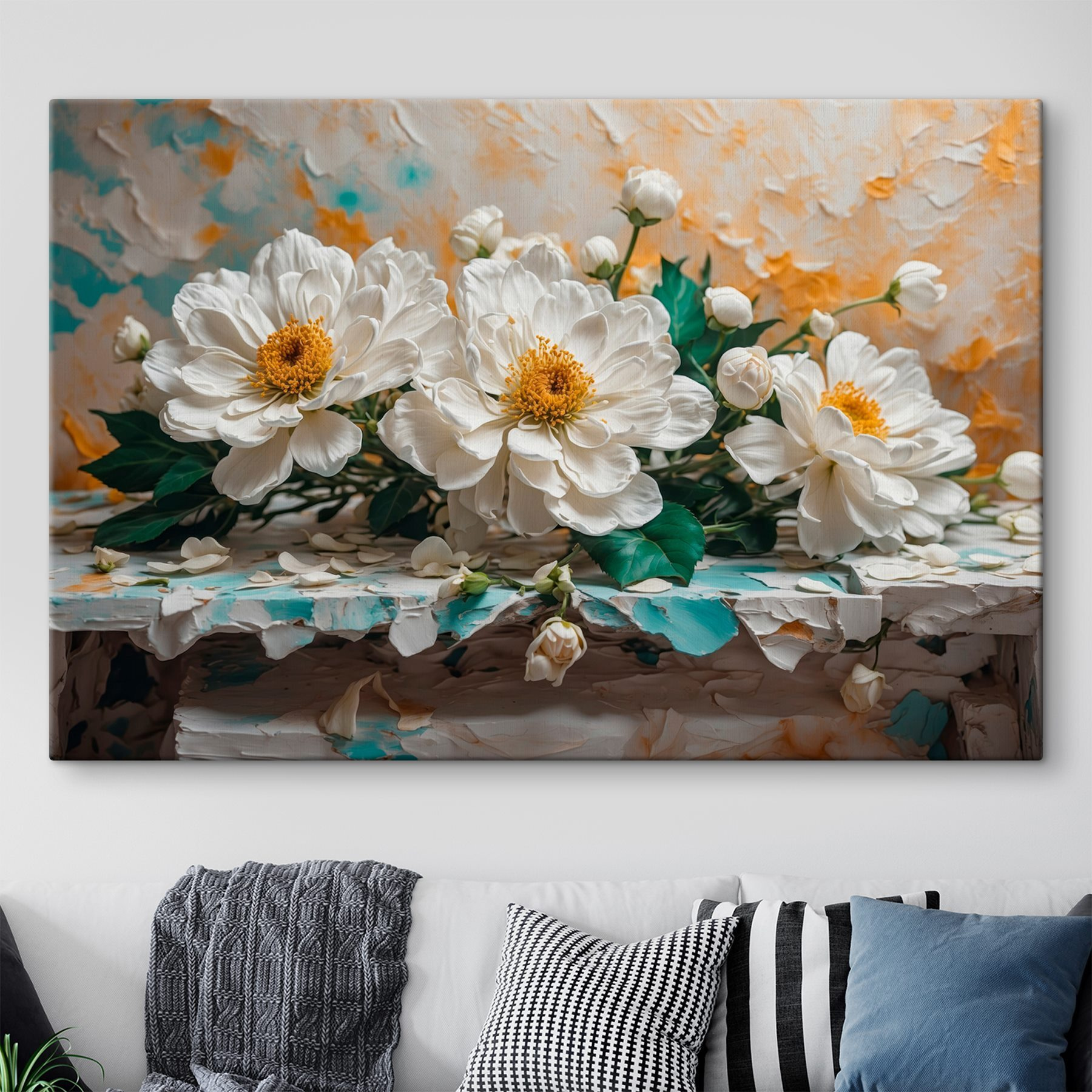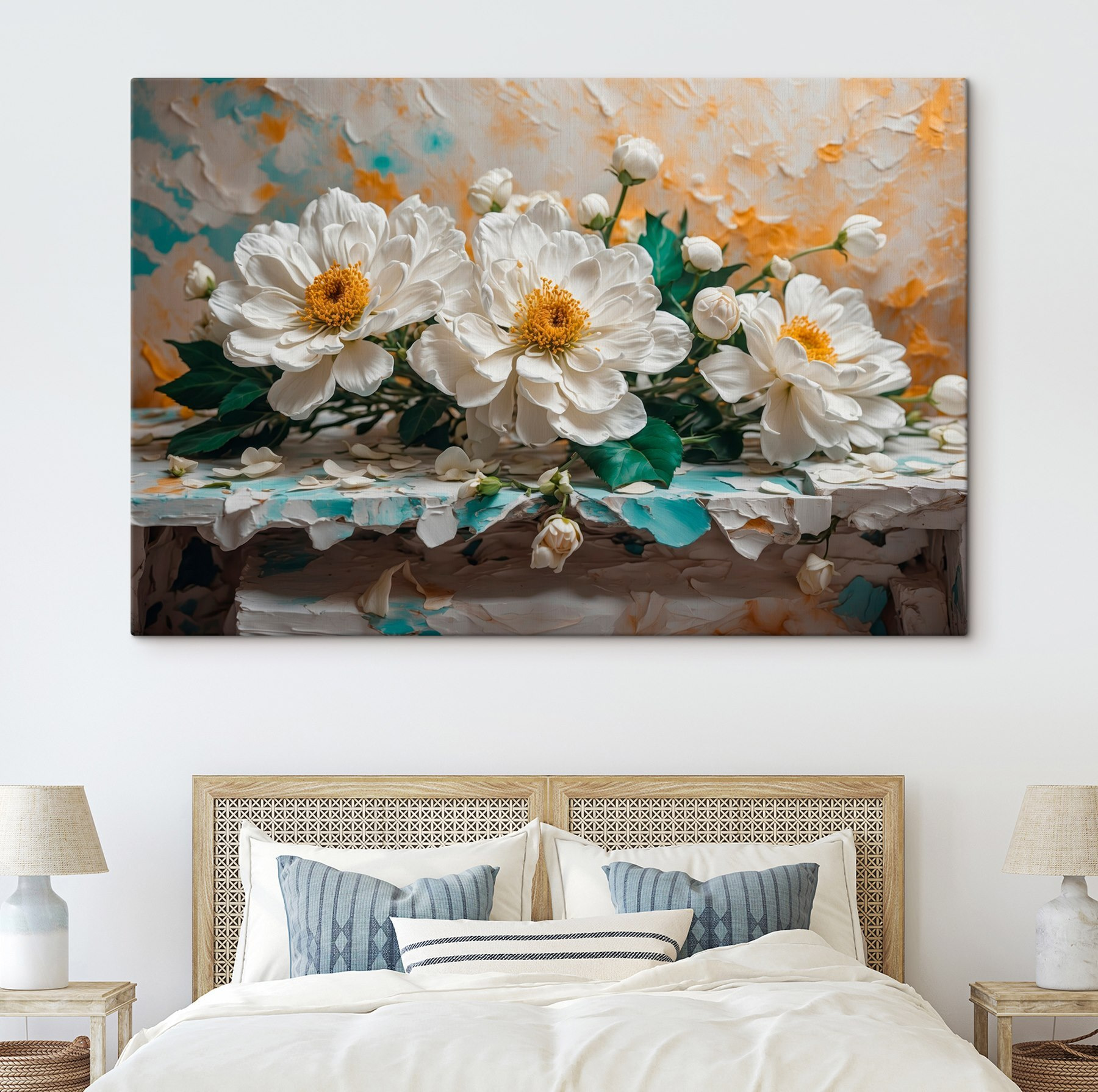 Verschönern Sie jeden Raum mit diesem hübschen Leinwanddruck, der eine Gruppe weißer Blumen zeigt. Er bringt ein Gefühl von Ruhe und frischer Luft an Ihre Wände. Stellen Sie sich vor, Sie betreten einen Raum und fühlen sich, als wären Sie gerade in einen ruhigen Garten getreten – weiche Blütenblätter und sanfte Farben flüstern Entspannung.