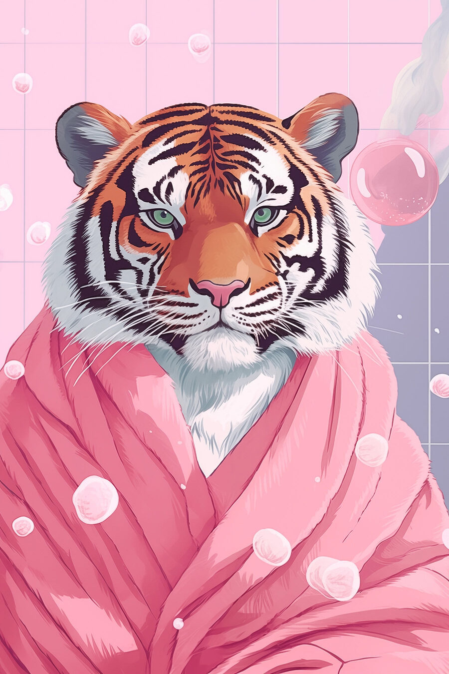 Meet your new decor obsession: a striking canvas print of a tiger lounging in a pink robe, complete with bubbles for that extra touch of whimsy. Imagine this feline fashionista gracing your wall, exuding an air of relaxed confidence. It’s like he’s just come from a spa day, and who wouldn’t want that vibe in their living room? Perfect for animal lovers or anyone with a taste for the eclectic—and let’s face it, who doesn’t need a little unexpected charm in their life? Bring home some playful elegance and watch your guests do a double take. A conversation starter, indeed!
