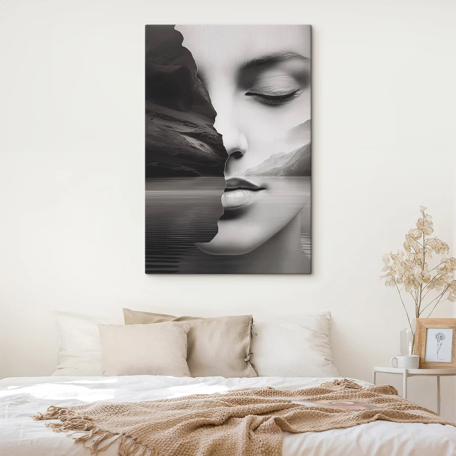 This stunning canvas print, featuring a woman’s face merged with a tranquil landscape, brings a unique vibe to any space. Imagine it gracing your living room wall, catching the eye of anyone who enters. The black and white tones create a lovely, soothing contrast—perfect for those moments when the world’s a bit too loud. It’s like a gentle reminder to pause and reflect.
