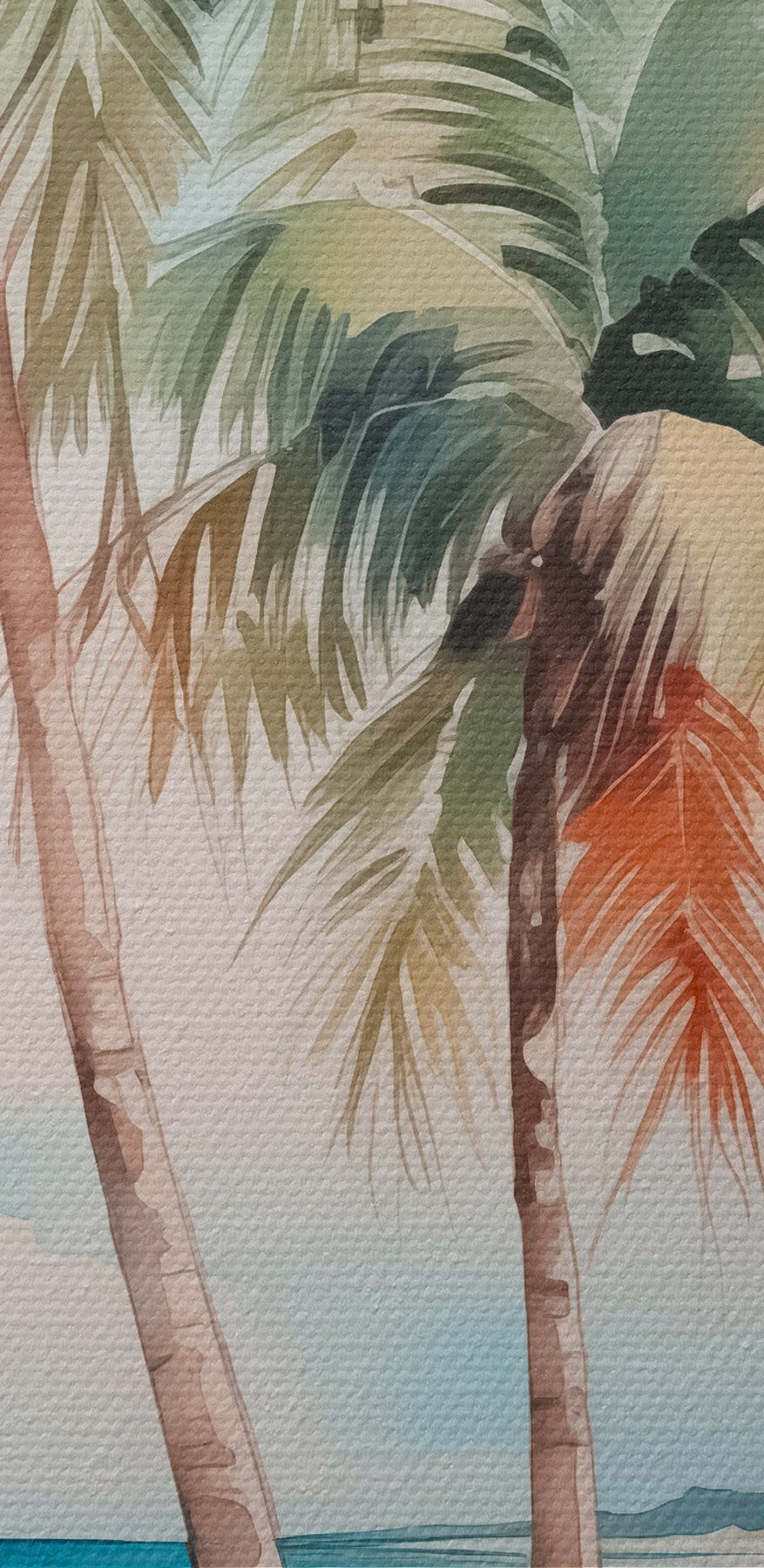 Stellen Sie sich Folgendes vor: weicher Sand zwischen Ihren Zehen, sanft an die Küste schlagende Wellen und Palmen, die sich in der warmen Brise wiegen. Dieser Leinwanddruck mit dem Titel „Palm Trees on a Beach” versetzt jeden direkt in einen traumhaften Küstenurlaub. Es ist, als würde man ein Stück Paradies in sein Zuhause holen – ohne Sonnenbrand oder Sand, der von Möwen aufgewirbelt wird.
