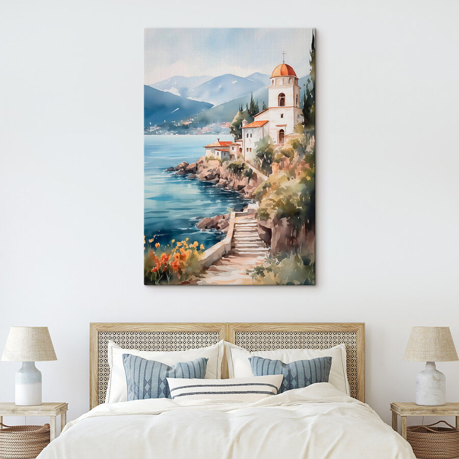 Verwandeln Sie Ihre Wand in einen Ort der Ruhe mit diesem wunderschönen Aquarell eines Gebäudes an einer Klippe neben einem glitzernden Gewässer. Es ist, als würde man in einen Tagtraum eintauchen, in dem die Meeresbrise Geheimnisse flüstert und die Berge in ihrer ganzen Pracht Wache stehen. Stellen Sie sich vor, Sie sitzen in Ihrer gemütlichen Ecke, nippen an Ihrem Lieblingsgetränk und verlieren sich in den sanften Farbtönen und zarten Pinselstrichen. Es ist genau das richtige Maß an Fernweh, das uns an friedliche Ausflüge und sonnige Abenteuer erinnert. Perfekt für jeden Raum, sagt es: „Das Leben ist zu kurz, um die Aussicht nicht zu genießen!“ Machen Sie sich bereit für ernsthafte Tagträume!