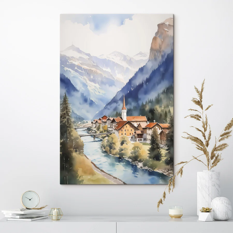Stellen Sie sich vor, Sie betreten ein charmantes kleines Dorf inmitten hoch aufragender Berge. Genau das fängt dieser Leinwanddruck in Aquarellfarben ein – die ruhige Schönheit eines Rückzugsortes in den Bergen. Sanfte Blautöne verschmelzen mit warmen Erdfarben und schaffen eine gemütliche Atmosphäre, in der man sich sofort wie zu Hause fühlt. Hängen Sie ihn in Ihrem Wohnzimmer auf und beobachten Sie, wie er Gespräche über Abenteuer, versteckte Zufluchtsorte und Träume von Reisen an Orte wie diesen anregt. Die anmutigen Pinselstriche des Gemäldes vermitteln ein Gefühl der Ruhe, ähnlich wie eine sanfte Brise, die durch die Bäume rauscht. Und wer liebt nicht ein Kunstwerk, das einem zuflüstert: „Entspann dich, du bist im Urlaub“? Perfekt für alle, die sich einen Hauch von Natur wünschen, ohne die Couch zu verlassen!