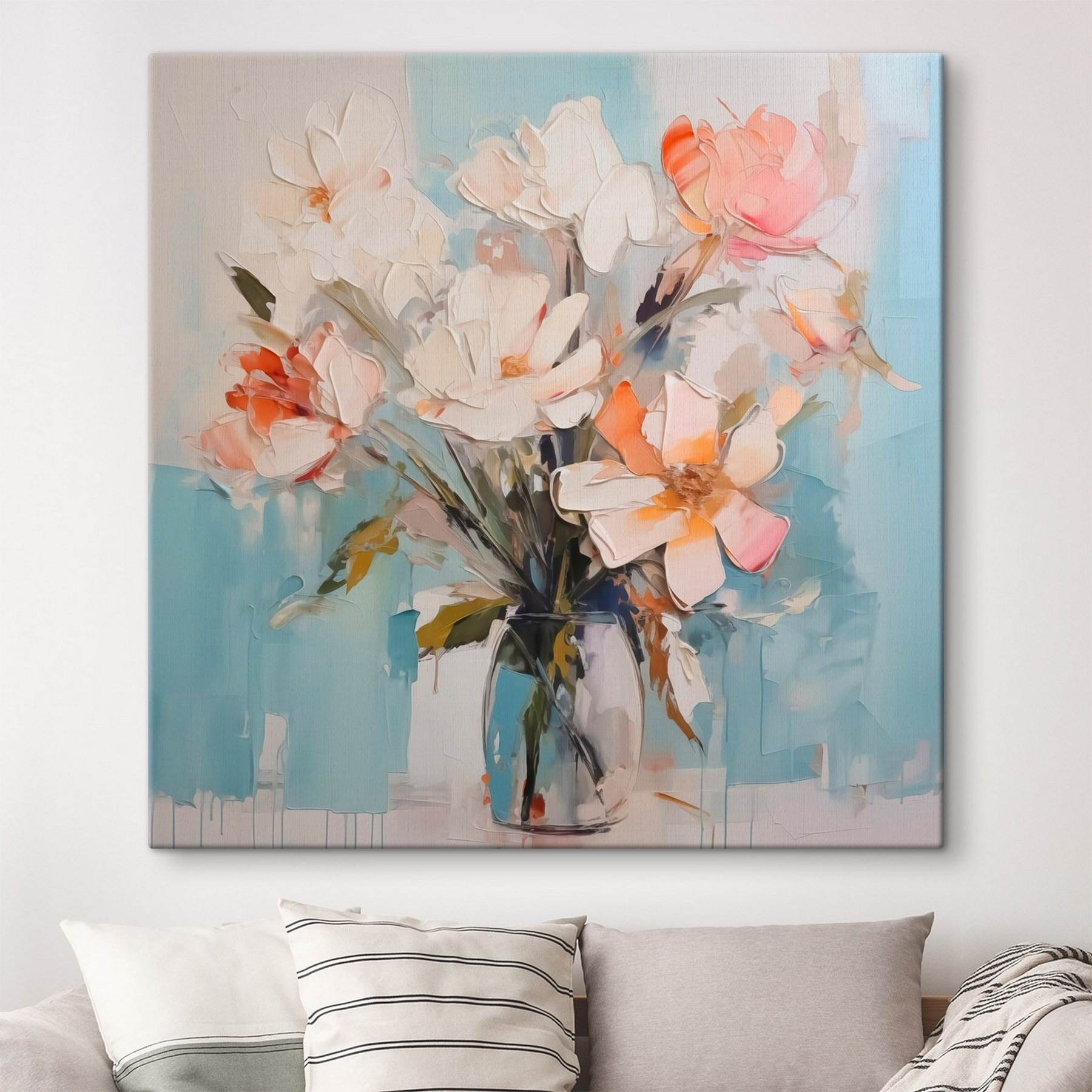 Verändern Sie jeden Raum mit diesem lebendigen Leinwanddruck von Blumen in einer Vase. Stellen Sie sich vor, Sie betreten einen Raum und werden von einer Explosion von Blütenblättern und lebendigen Farben begrüßt – es ist wie ein kleiner Garten, der Sie zu Hause willkommen heißt. Die sanften Pastelltöne tanzen vor einem kühlen blauen Hintergrund und schaffen eine heitere Atmosphäre. Jeder Blick auf dieses Stück könnte Ihnen ein Lächeln entlocken oder sogar einen Tagtraum von sonnigen Tagen hervorrufen. Perfekt, um eine ruhige Ecke zu erhellen oder eine gemütliche Ecke zu verschönern – ein reizender Touch, der Wärme und Charme versprüht. Wer würde sich nicht über ein bisschen Natur im Haus freuen?