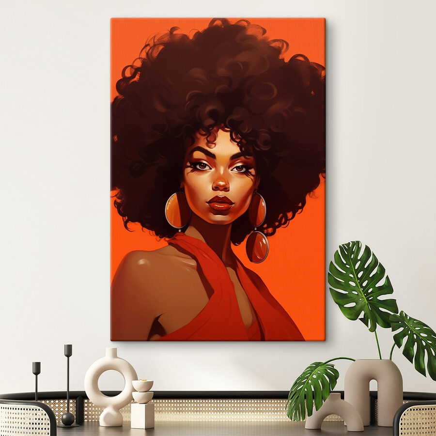 Verleihen Sie Ihrem Raum mit diesem faszinierenden Leinwanddruck einer Frau mit großem, lockigem Afro und auffälligen Ohrringen einen Hauch von Persönlichkeit. Die satten Farben und markanten Details lassen das Bild lebendig wirken, fast so, als würde sie jedem, der sie ansieht, eine Geschichte erzählen wollen. Stellen Sie sich vor, wie sie Ihr Wohnzimmer oder Ihr Heimbüro verschönert – das hebt sofort die Stimmung. Sie strahlt Selbstvertrauen und Charme aus, nicht wahr? Perfekt, um Gespräche anzuregen oder einfach nur langweiligen Wänden eine fröhliche Note zu verleihen. Dieses Kunstwerk lässt jeden Raum aufleben. Es ist nicht nur Dekoration, sondern eine lebendige Präsenz, die selbst die trübsten Tage erhellen kann. Und wer liebt nicht ein wenig zusätzliche Würze in seiner Umgebung?