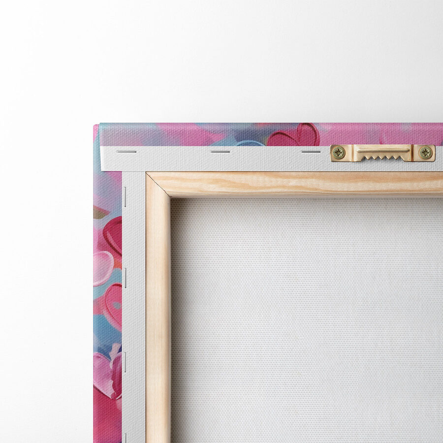 Dieser Leinwanddruck, der vor einem beruhigenden blauen Hintergrund mit hübschen Herzen übersät ist, wirkt wie eine warme Umarmung für Ihre Wände. Es ist die Art von Kunst, die süße Nichtigkeiten flüstert und jeden Raum gemütlich und einladend macht. Stellen Sie sich vor, Sie trinken an einem regnerischen Tag Kaffee und lassen sich von den fröhlichen Farben aufmuntern. Oder stellen Sie sich vor, wie er das Kinderzimmer erhellt und die Schlafenszeit in ein Märchen verwandelt. Dieses Werk ist perfekt für alle, die einzigartige Dekorationen lieben, und erinnert auf spielerische Weise daran, dass Liebe alle Formen und Farben hat – genau wie Herzen! Außerdem regt es zu Gesprächen an – wer würde nicht gerne über fröhliche Kunst plaudern?