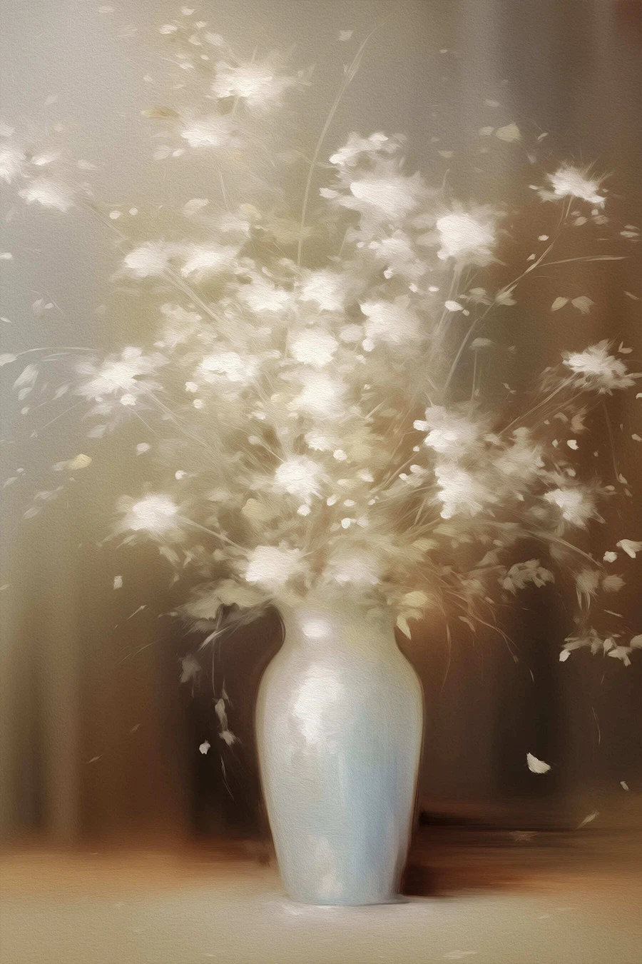 Verschönern Sie jeden Raum mit diesem hübschen Leinwandbild, das eine zarte weiße Vase mit ätherischen weißen Blumen zeigt. Es ist, als ob die Natur beschlossen hätte, ein Nickerchen zu machen und sanft in der Ecke Ihres Wohnraums zu träumen. Stellen Sie sich vor, Sie gehen daran vorbei und spüren, wie eine Welle der Ruhe über Sie hereinbricht und die Einfachheit ein Lächeln auf Ihr Gesicht zaubert. Sie verleiht allem das richtige Gefühl – perfekt für Momente, in denen man eine kleine Erfrischung braucht. Ob im Flur oder über einer gemütlichen Couch, dieses Stück verleiht einen Hauch von Gelassenheit, dem man nur schwer widerstehen kann. Außerdem passt es zu so gut wie allem, also lassen Sie Ihren Einrichtungsstil aufblühen, während es hübsch dasteht. Ihre Wände haben ein wenig Charme verdient, nicht wahr?