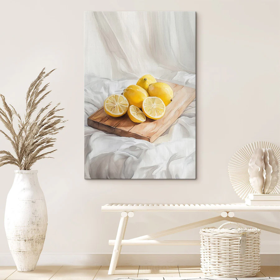 Dieser hübsche Leinwanddruck mit einer fröhlichen Gruppe von Zitronen, die auf einem Schneidebrett liegen, bringt jeden Raum zum Strahlen. Es ist wie ein kleines Stück Sonnenschein direkt an der Wand! Stellen Sie sich vor, Sie betreten einen Raum und spüren diesen spritzigen Farbklecks, der Ihre Laune sofort hebt. Dieses Kunstwerk ist perfekt für alle, die einen Hauch von Frische lieben – ob in der Küche oder im Esszimmer – und bringt einen Hauch von spielerischem Charme und Wärme mit sich. Und vielleicht inspiriert es Sie sogar zu einem Limonadenstand in Ihrem Wohnzimmer – wer träumt nicht gerne ein wenig? Lassen Sie diese Zitrusfrucht eine einladende Atmosphäre entstehen, die zum Lächeln und zu Gesprächen bei Essen und Trinken einlädt. Ein echter Gesprächsstarter!