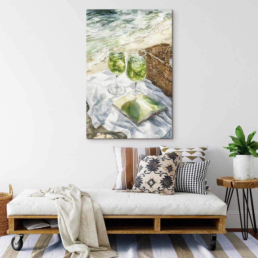Verleihen Sie jedem Raum einen Hauch von Gelassenheit mit diesem wunderschönen Leinwanddruck in Aquarelltechnik. Stellen Sie sich vor: zwei Gläser erfrischender Wein, ein gemütlicher Picknickkorb und ein Buch, das nur darauf wartet, geöffnet zu werden, vor dem Hintergrund sanfter Wellen. Es ist wie eine Einladung zu einem entspannten Nachmittag in der Sonne, an dem Sie jeden Schluck und jedes Wort genießen können. Dieses Werk eignet sich perfekt für Küchen, Essbereiche oder andere Orte der Entspannung und weckt Freude, Nostalgie und vielleicht sogar ein wenig Fernweh. Es ist Kunst, die flüstert: „Mach eine Pause, du hast es dir verdient!“ Mit seinen sanften Farben und der einladenden Szene zaubert es jedem ein Lächeln ins Gesicht und lässt ihn von Picknicks am Strand träumen. Perfekt unvollkommen, genau wie das Leben.