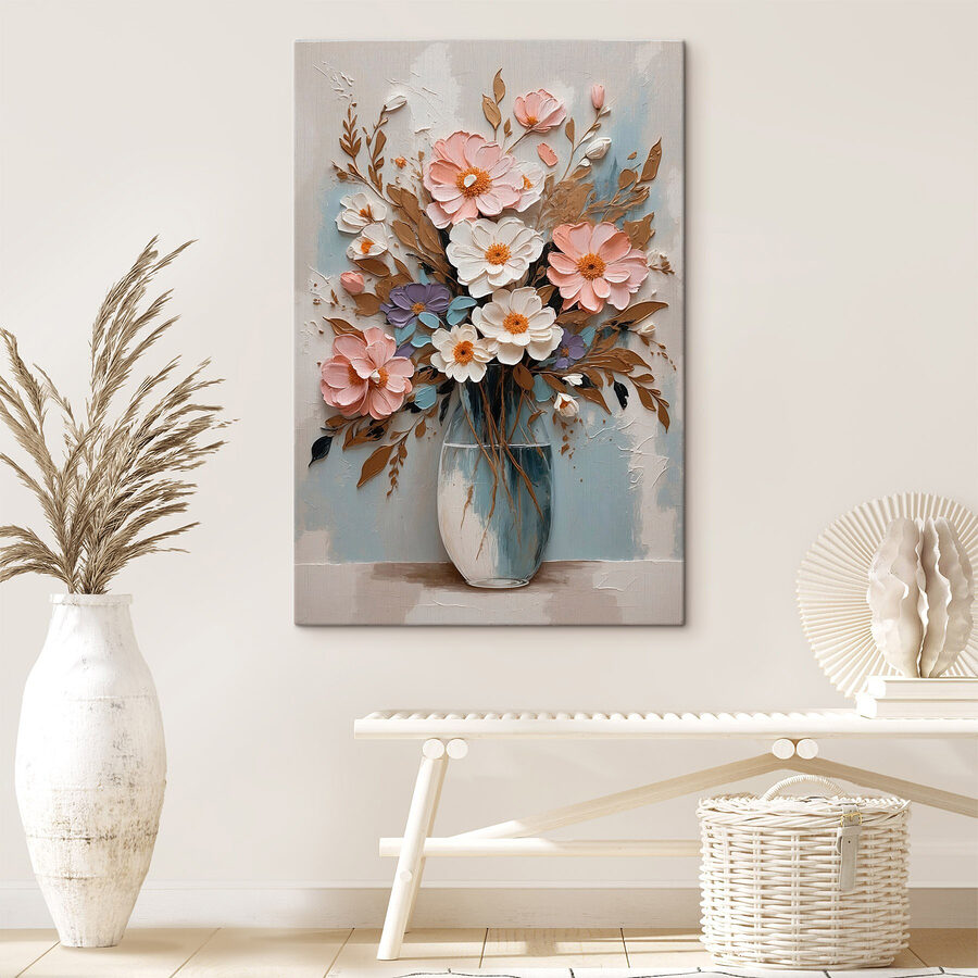 Erhellen Sie Ihren Raum mit diesem lebendigen Leinwandbild mit Blumen in einer Vase, einer charmanten Ergänzung, die Wärme und Fröhlichkeit ausstrahlt. Stellen Sie es sich über Ihrer Couch oder in einer gemütlichen Nische vor – ein sofortiger Stimmungsaufheller, oder? Die verspielten Blüten, die mit so viel Flair gemalt wurden, scheinen sich sanft zu wiegen und laden den Raum zur Freude ein. Es ist, als hätte man einen kleinen Garten im Haus, nur ohne das lästige Gießen. Freunde könnten innehalten, tief einatmen und einfach lächeln. Perfekt, um jeder Wand einen Hauch von Persönlichkeit zu verleihen, flüstert dieses Stück: “Das Leben ist zu kurz – genieße die Schönheit!” Geben Sie Ihren Wänden etwas, worüber sie sich unterhalten können.