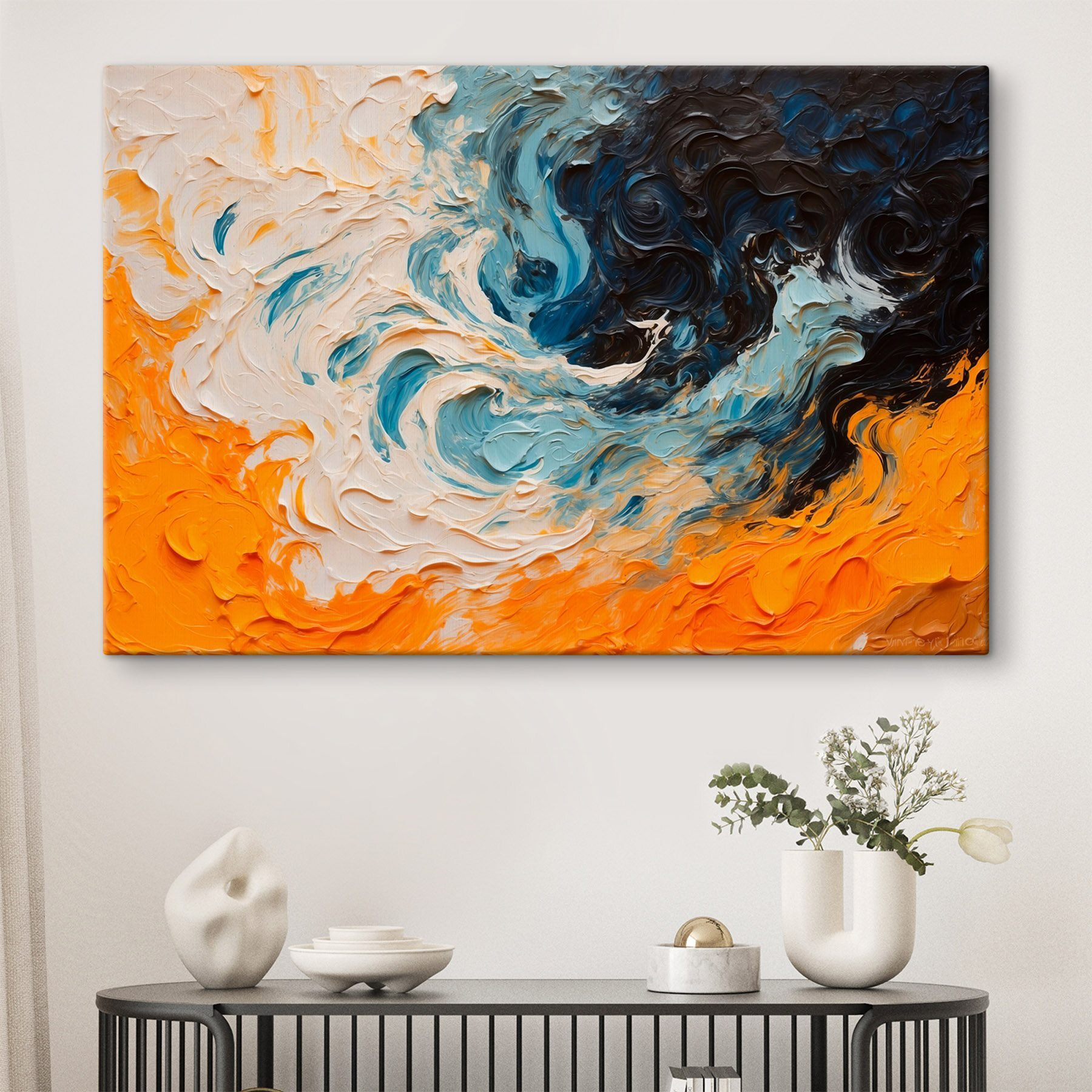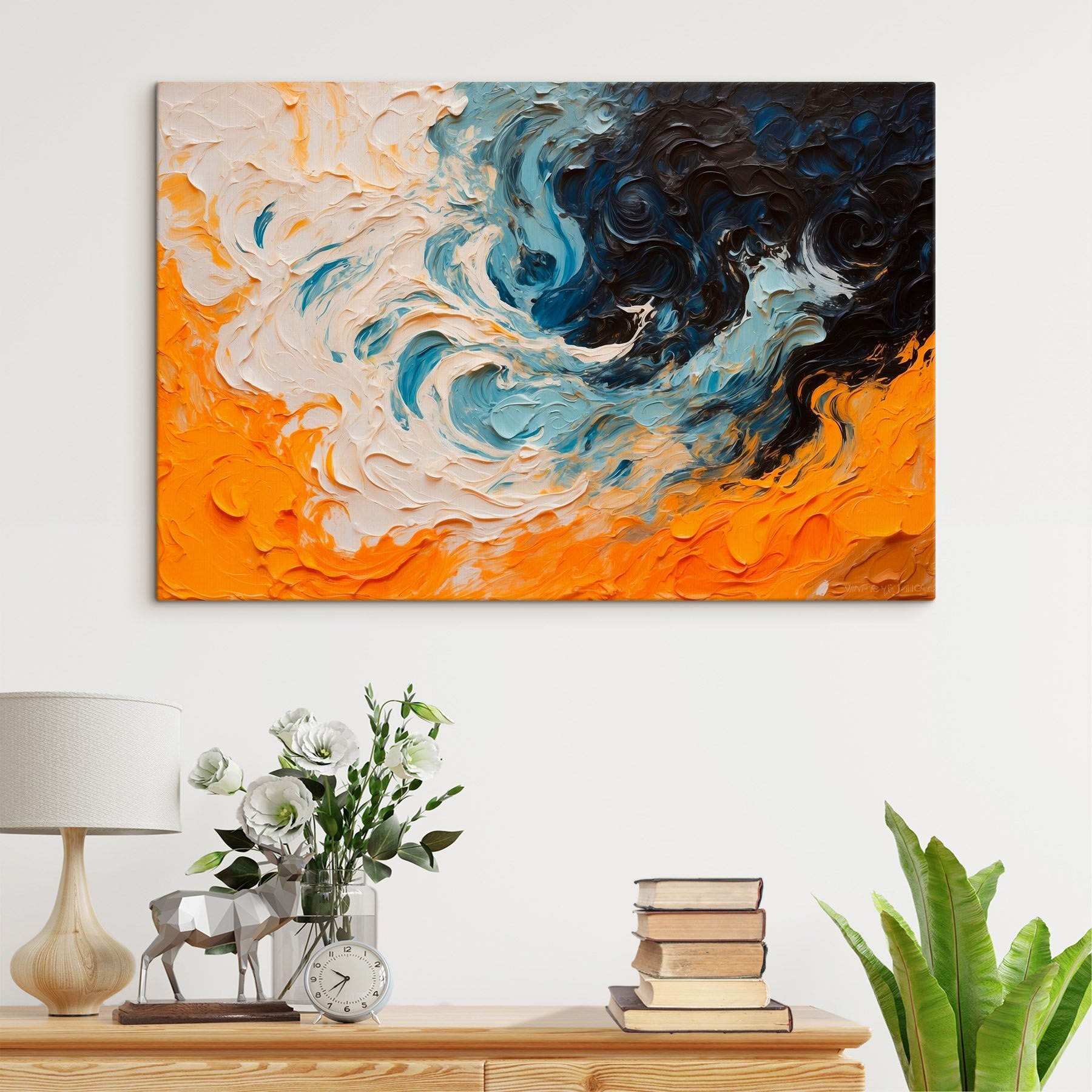 Tauchen Sie ein in eine lebhafte Farbexplosion mit diesem Leinwanddruck, der aussieht, als wäre er direkt aus dem Traum eines Künstlers entsprungen. Jeder Strudel und Wirbel fängt eine Welt voller Emotionen ein und lädt Sie dazu ein, das faszinierende Zusammenspiel von tiefen Blautönen, warmen Orangetönen und sanften Cremetönen zu erkunden. Stellen Sie sich einen gemütlichen Nachmittag vor, an dem Sie an einem Kaffee nippen, während dieses Kunstwerk Ihre Fantasie anregt – vielleicht inspiriert es sogar zu einer spontanen Tanzeinlage in Ihrem Wohnzimmer. Es eignet sich perfekt als Wandschmuck oder als fröhlicher Blickfang in jedem Raum und ist ein echter Stimmungsaufheller. Machen Sie sich bereit, Ihre Wände sprechen zu lassen!