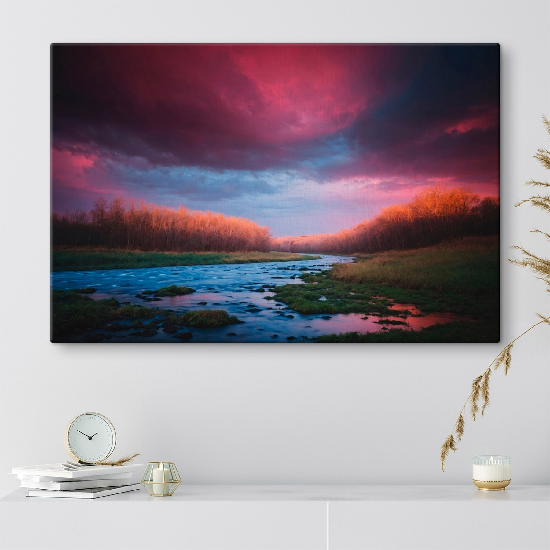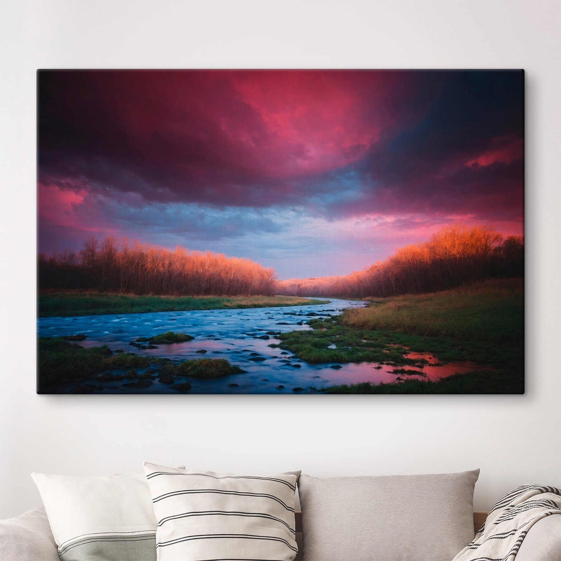 Stellen Sie sich vor, Sie betreten ein gemütliches Zimmer und werden von einem ruhigen Fluss begrüßt, der sich durch einen üppigen Wald schlängelt, genau wie dieser bezaubernde Leinwanddruck. Es ist nicht nur Kunst, es ist eine kleine Flucht. Die sanften Blautöne des Wassers tanzen mit den warmen Farben der Bäume und schaffen eine beruhigende Atmosphäre, die jede Wand in einen friedlichen Rückzugsort verwandeln kann. Perfekt, um sich mit einem Buch einzukuscheln oder an einem Kaffee zu nippen, während man von Abenteuern in der Natur träumt. Wer würde nicht gerne einen Hauch von Wildnis im Haus haben? Es ist, als ob man sich die freie Natur ins Haus holt – abgesehen von den Käfern, versteht sich!