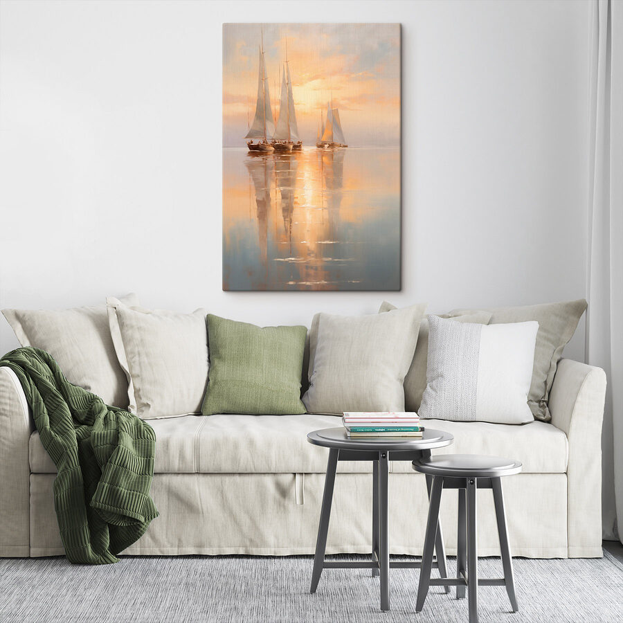 Stellen Sie sich vor, Sie tauchen jedes Mal in eine ruhige Welt ein, wenn Sie einen Blick auf diese atemberaubende Leinwand mit Segelbooten werfen, die über ein ruhiges Meer gleiten. Die sanften Farbtöne des Sonnenuntergangs tauchen den Himmel in warmes Licht und vermitteln das Gefühl einer gemütlichen Umarmung. Dieses Kunstwerk hängt nicht nur an der Wand, sondern lädt zu entspannten Nachmittagen ein, an denen Sie Limonade trinken und von fernen Ufern träumen können. Stellen Sie sich vor, wie Gäste in Ihren Raum schlendern und einen Moment lang die ruhige Atmosphäre genießen. Jeder Blick ist wie eine kleine Auszeit – perfekt für alle, die die Natur und die Ruhe des Ozeans lieben. Außerdem könnte es Sie zu einem unerwarteten Segelabenteuer inspirieren – wer weiß?