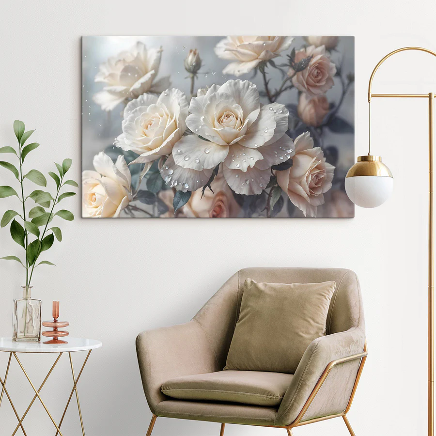 Transform your wall into a serene garden with this lovely canvas print featuring a group of white roses adorned with glistening water drops. It’s like having a fresh bouquet—without the constant upkeep! Imagine sitting in your favorite chair, a cup of coffee in hand, and feeling the calm that these soft petals bring. The subtle colors invite tranquility, making any space feel a touch more inviting. Perfect for the living room or a cozy nook, this artwork whispers charm and elegance. Who wouldn’t smile at such delicate beauty? Perfect for flower lovers or anyone needing a little floral cheer.