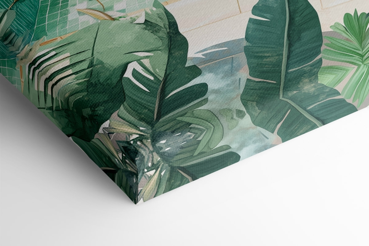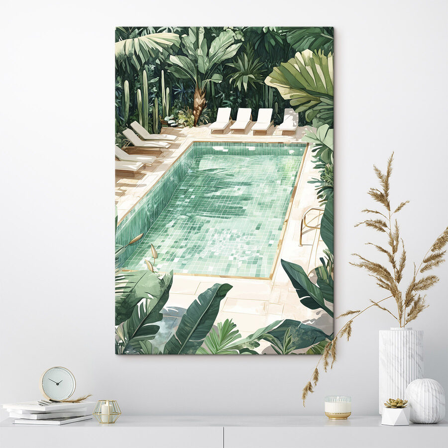 Betreten Sie ein kleines Stück vom Paradies mit diesem auffälligen Leinwanddruck, der einen charmanten Pool inmitten von üppigem Grün zeigt. Stellen Sie sich vor, wie Sie es sich in den bequemen Stühlen gemütlich machen, mit einem Cocktail in der Hand, während die Sonne durch die Blätter scheint. Die heiteren Farben vermitteln ein Gefühl der Ruhe und Erfrischung, so dass es schwer fällt, nicht von warmen Tagen und faulen Nachmittagen zu träumen. Es ist das perfekte Stück für jeden Raum, der einen Hauch von Naturglück gebrauchen kann. Hängen Sie es auf und lassen Sie die gute Stimmung aufkommen – wer braucht schon einen Urlaub, wenn diese Schönheit Ihrem Raum einen Hauch von Ruhe verleiht?
