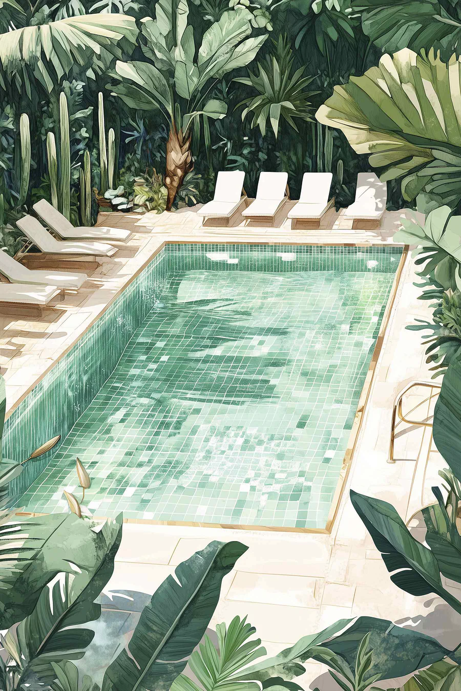 Betreten Sie ein kleines Stück vom Paradies mit diesem auffälligen Leinwanddruck, der einen charmanten Pool inmitten von üppigem Grün zeigt. Stellen Sie sich vor, wie Sie es sich in den bequemen Stühlen gemütlich machen, mit einem Cocktail in der Hand, während die Sonne durch die Blätter scheint. Die heiteren Farben vermitteln ein Gefühl der Ruhe und Erfrischung, so dass es schwer fällt, nicht von warmen Tagen und faulen Nachmittagen zu träumen. Es ist das perfekte Stück für jeden Raum, der einen Hauch von Naturglück gebrauchen kann. Hängen Sie es auf und lassen Sie die gute Stimmung aufkommen – wer braucht schon einen Urlaub, wenn diese Schönheit Ihrem Raum einen Hauch von Ruhe verleiht?