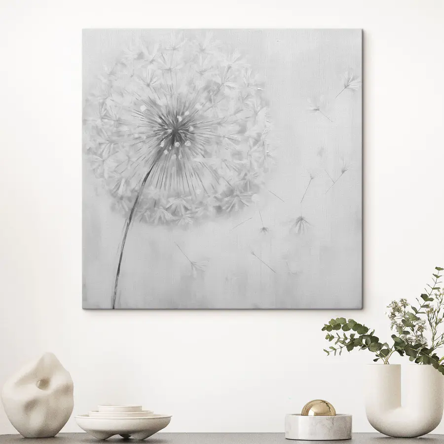 Dieser bezaubernde Leinwanddruck, der eine zarte Pusteblume zeigt, verwandelt jeden Raum. Es ist nicht nur Kunst, sondern ein in der Zeit eingefrorener Moment, der den wunderlichen Tanz der Samen einfängt, von denen jeder einzelne einen winzigen Wunsch erfüllt. Stellen Sie sich vor, Sie betrachten dieses Werk, während Sie an Ihrem Kaffee nippen, und spüren eine Leichtigkeit, als ob die Möglichkeiten der Welt nur einen Atemzug entfernt wären. Perfekt, um einer gemütlichen Ecke einen Hauch von minimalistischem Charme zu verleihen oder eine formellere Umgebung zu erhellen. Es flüstert Gelassenheit und macht es schwer, nicht zu lächeln. Minimaler Aufwand, maximale Wirkung!