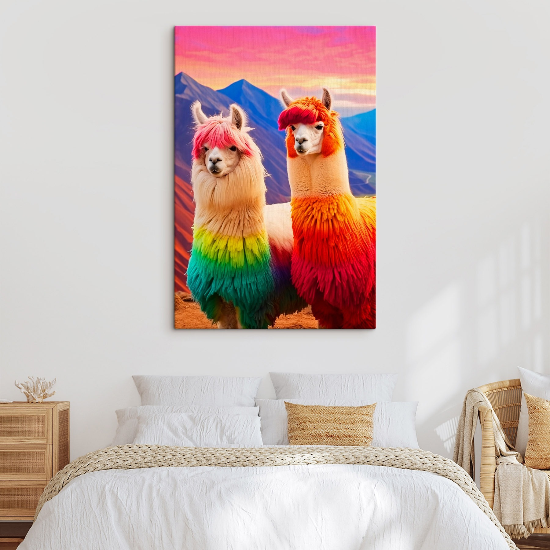 Dieser skurrile Leinwanddruck mit zwei Lamas mit lebhaftem regenbogenfarbenem Haar bringt jeden Raum zum Strahlen. Diese lebhaften Kreaturen bringen einen skurrilen Touch an Ihre Wand, perfekt für Tierliebhaber oder alle, die einen Farbtupfer in ihre Einrichtung bringen wollen. Stellen Sie sich vor, Sie betreten Ihren Raum und werden sofort von ihren fröhlichen Gesichtern begrüßt. Es ist, als hätte man ein fröhliches Haustier, das nicht gefüttert oder ausgeführt werden muss! Ob in einem gemütlichen Wohnzimmer oder einem lustigen Bastelraum, dieser Druck sorgt für Lächeln und Gesprächsstoff. Diese Lamas sind bereit, Ihre Atmosphäre zu beleben!