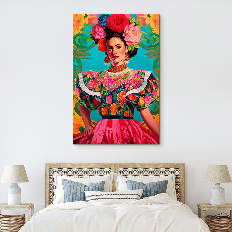 Dieser atemberaubende Leinwanddruck mit einer Frau in einem farbenfrohen, blumengeschmückten Kleid und einem lebhaften Blumenstrauß im Haar bringt jeden Raum zum Strahlen. Stellen Sie sich vor, es hängt in einer gemütlichen Ecke und bringt einen Hauch von Natur ins Haus. Es ist wie eine Gartenparty direkt an der Wand, die jedes Mal ein Lächeln hervorruft, wenn jemand vorbeikommt. Perfekt für alle, die einzigartige Dekoration lieben, fängt dieses Stück die Essenz von Freude und Festlichkeit ein. Lassen Sie sich zu Tagträumen von sonnenbeschienenen Tagen und warmen Brisen inspirieren und verwandeln Sie Ihren Raum in einen fröhlichen Zufluchtsort. Wer würde sich diese Art von Atmosphäre nicht wünschen?