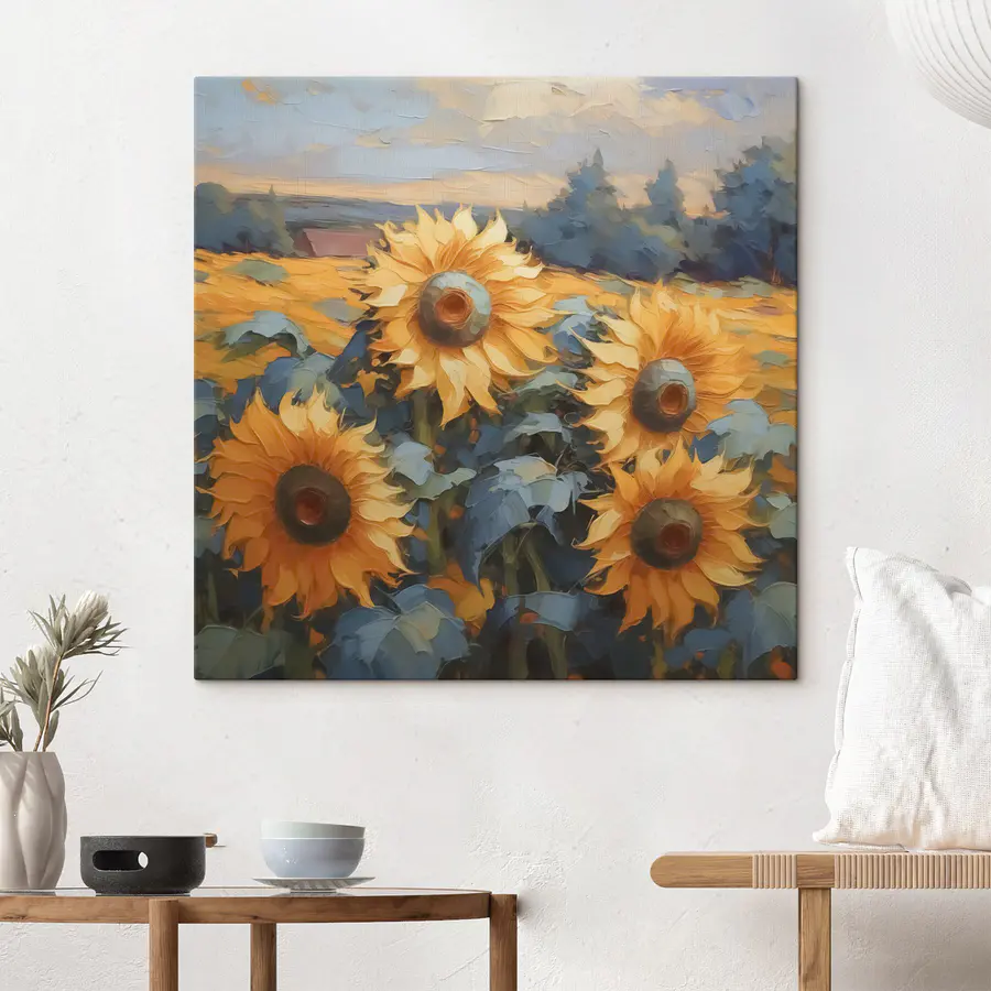 Dieser lebendige Leinwanddruck mit tanzenden Sonnenblumen in einem goldenen Feld bringt jeden Raum zum Strahlen. Es ist wie ein Ausbruch von Sonnenschein direkt an Ihrer Wand, perfekt, um Ihr Zuhause mit Wärme und Freude zu erfüllen. Stellen Sie sich vor: ein gemütlicher Morgen, ein Kaffee in der Hand, der Blick schweift zu den fröhlichen Blüten, die Sie daran erinnern, dass Schönheit überall ist. Diese Sonnenblumen scheinen direkt zurückzulächeln und machen jeden Tag ein bisschen fröhlicher. Ob im Wohnzimmer oder in einer fröhlichen Ecke, dieses Stück bringt gute Laune und ein Stück Natur nach drinnen – ganz ohne Gießen.