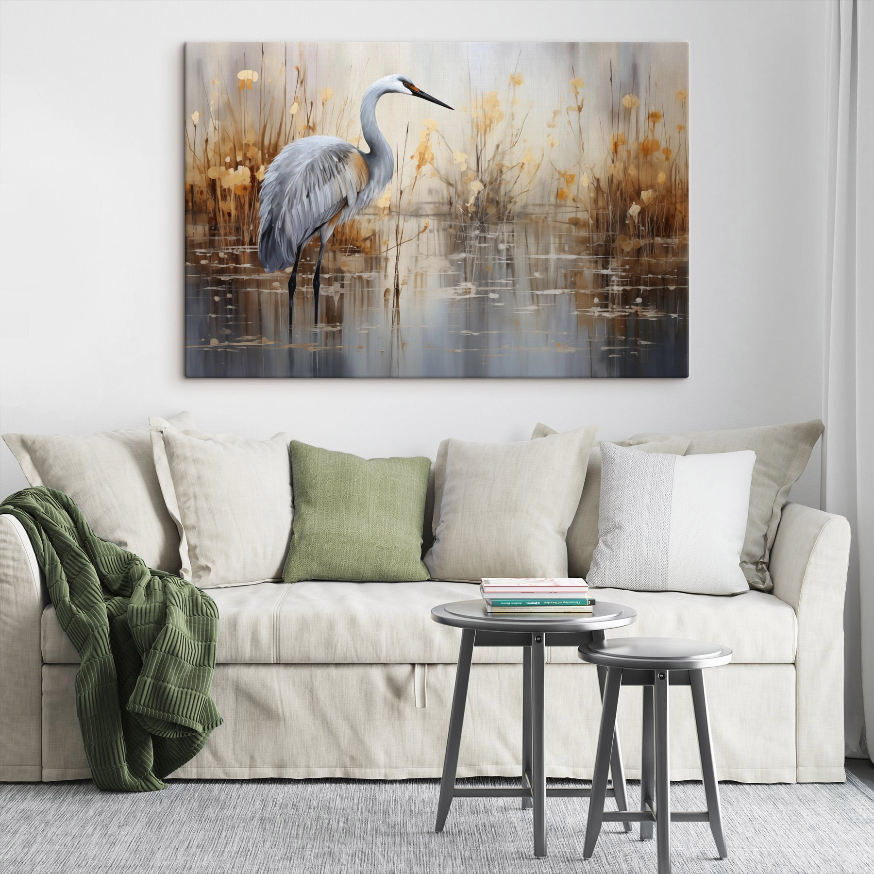 Bringen Sie einen Hauch von Natur ins Wohnzimmer mit diesem atemberaubenden Leinwanddruck eines Vogels, der anmutig im Wasser steht. Stellen Sie sich vor, wie er inmitten des üppigen Grüns und der ruhigen Reflektionen einfach nur chillt. Dieses Bild ist nicht nur Kunst, sondern auch eine kleine Flucht, wie ein Mini-Urlaub, jedes Mal, wenn es Ihnen ins Auge fällt. Die sanften Farbtöne fügen sich perfekt in jede Einrichtung ein und verleihen ihr eine Wärme, die sich einfach gut anfühlt. Und wer würde sich nicht wünschen, dass ein gefiederter Freund wie dieser über den Raum wacht? Er eignet sich perfekt, um ein Gespräch anzuregen oder einfach einen Moment der Ruhe nach einem langen Tag zu genießen. Wunderschön, finden Sie nicht auch?