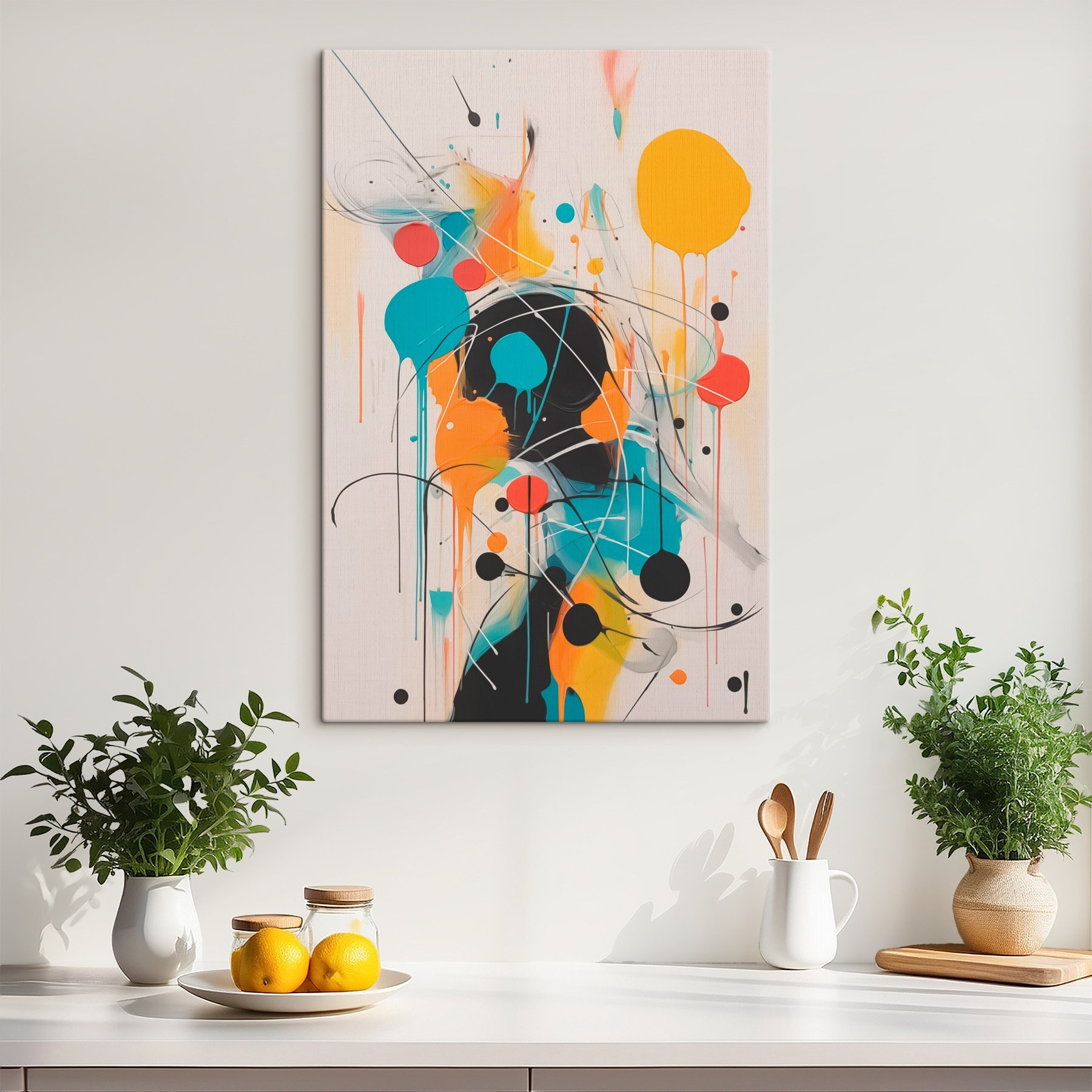 Dieser lebendige Leinwanddruck mit einem Reigen aus bunten Kreisen und Linien bringt jede Ecke zum Strahlen. Es ist wie ein fröhlicher Farbklecks, der sofort die Stimmung hebt. Stellen Sie sich vor, Sie betreten einen Raum, in dem dieses Bild hängt – die leuchtenden Farben scheinen mit Ihnen zu plaudern und laden Wärme und Kreativität in Ihren Raum ein. Es eignet sich perfekt für eine Kunstecke oder über einer gemütlichen Couch, und es ist schwer, nicht zu lächeln, wenn man es ansieht. Außerdem wird es bei geselligen Zusammenkünften für Gesprächsstoff sorgen. Wer hätte gedacht, dass Dekoration so lustig sein kann? Hängen Sie es auf und lassen Sie die gute Stimmung aufkommen!