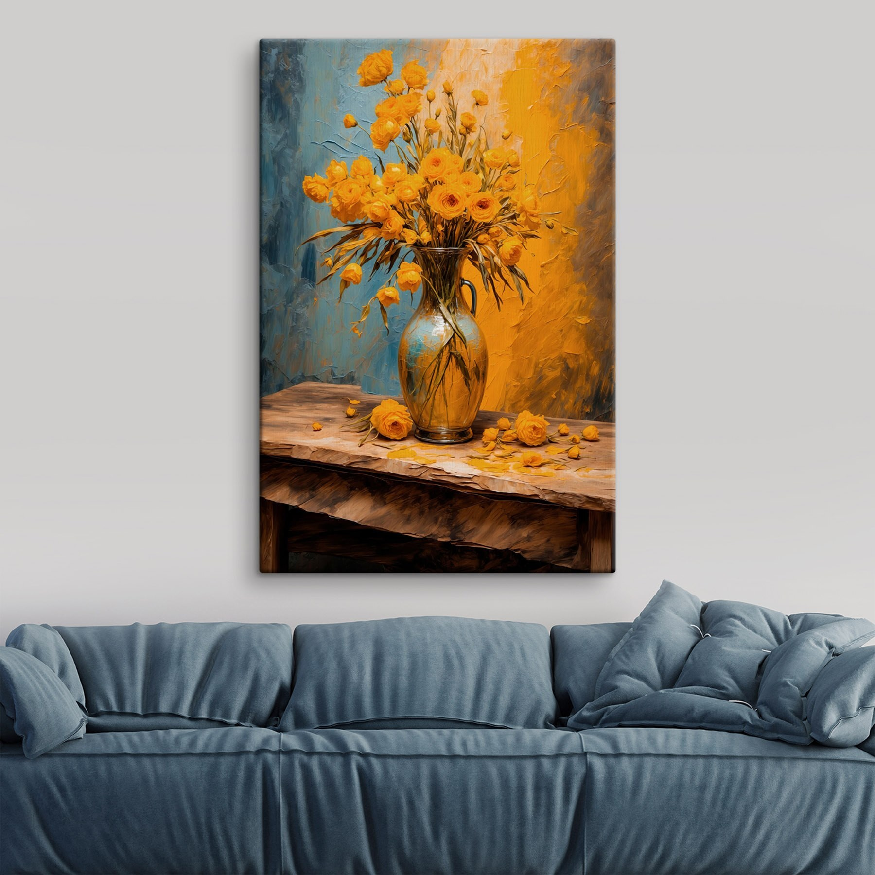 Dieses atemberaubende Leinwandbild mit einer Vase voller gelber Blumen erhellt jeden Raum. Es ist wie ein Ausbruch von Sonnenschein direkt an Ihrer Wand, der Ihrem Raum eine fröhliche Stimmung verleiht. Stellen Sie sich vor: Sie betreten den Raum und, BAM, diese lebendigen Blüten fallen Ihnen ins Auge und heben sofort die Stimmung. Perfekt für einen gemütlichen Wohnbereich oder sogar ein fröhliches Büro. Stellen Sie sich vor, Sie schlürfen einen Kaffee und genießen dabei die warmen Farben – es ist wie ein kleines Stück Sommer das ganze Jahr über. Wer würde sich diese Art von Freude nicht zu Hause wünschen? Außerdem könnte es zu einem spontanen Blumenpflück-Abenteuer inspirieren!