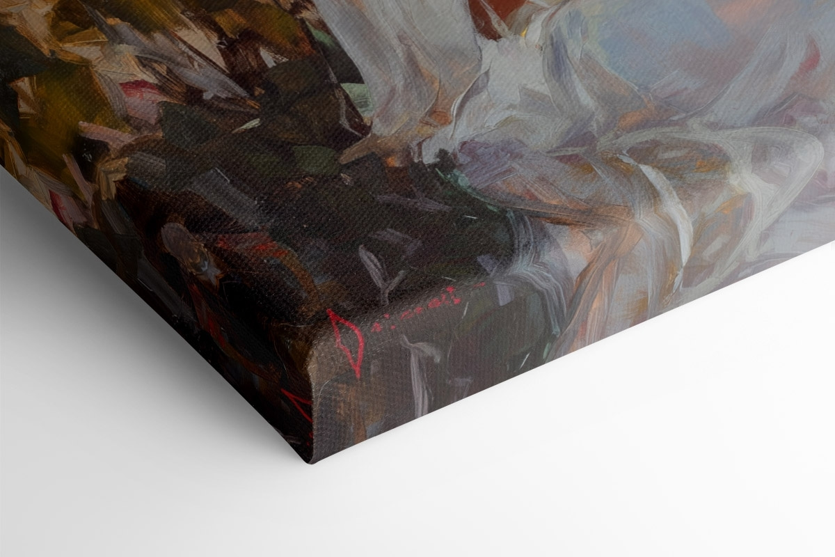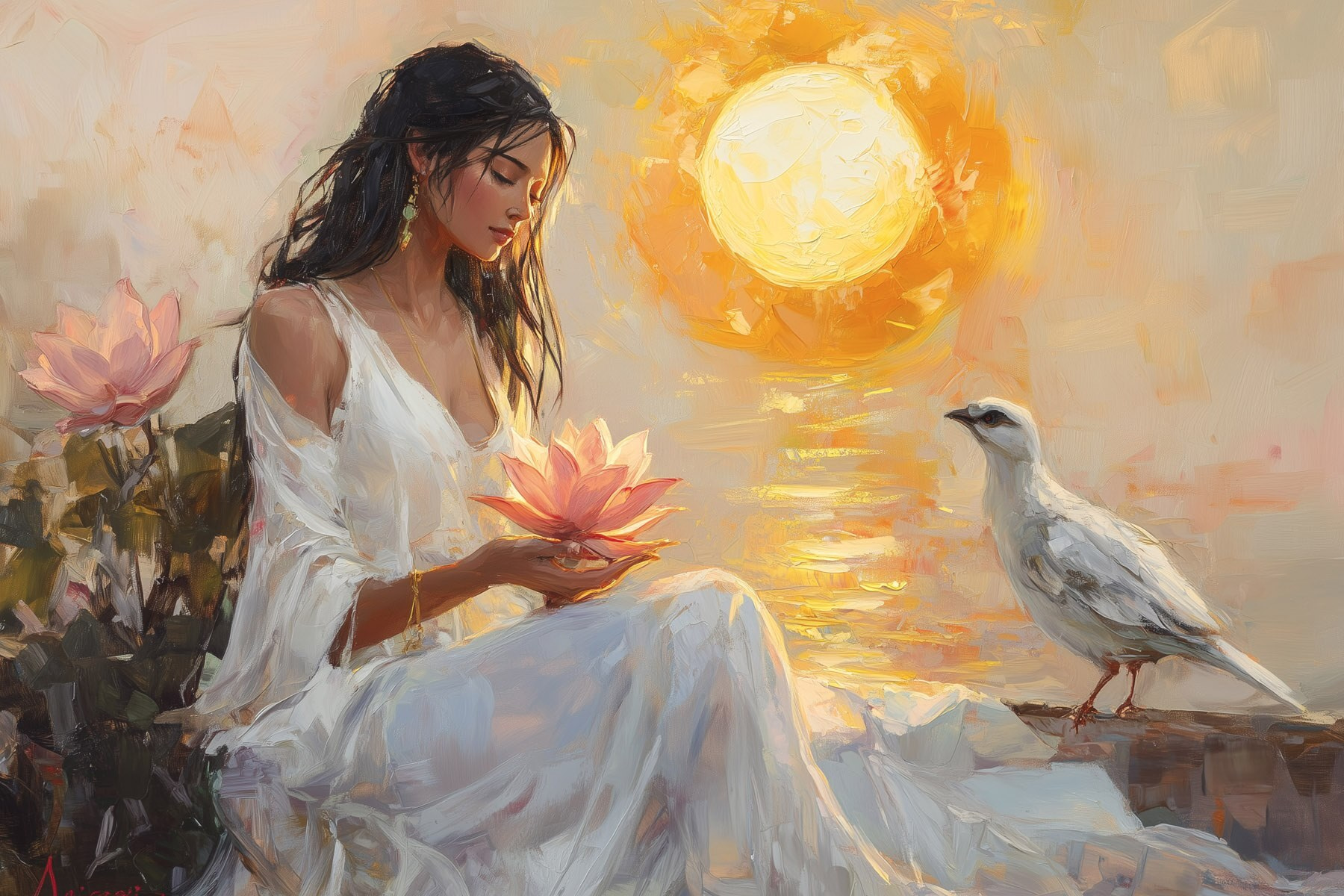 Stellen Sie sich einen Moment vor, der in der Zeit eingefroren ist: Eine heitere Frau wiegt eine Blume, während ein neugieriger Vogel ihr Gesellschaft leistet. Dieses Kunstwerk schmückt nicht nur Ihre Wand, es lädt auch zu Ruhe und Besinnung ein. Die warmen Farbtöne der untergehenden Sonne laden zum Entspannen ein, als ob sie ein Geheimnis teilen würden. Dieses Bild eignet sich perfekt für eine gemütliche Leseecke oder eine leere Wand, die einen Hauch von Persönlichkeit braucht, und vereint Schönheit und Ruhe. Jeder kann eine kleine Erinnerung daran gebrauchen, innezuhalten und die kleinen Dinge zu schätzen – wie eine blühende Blume oder einen Vogel auf einem Ast.