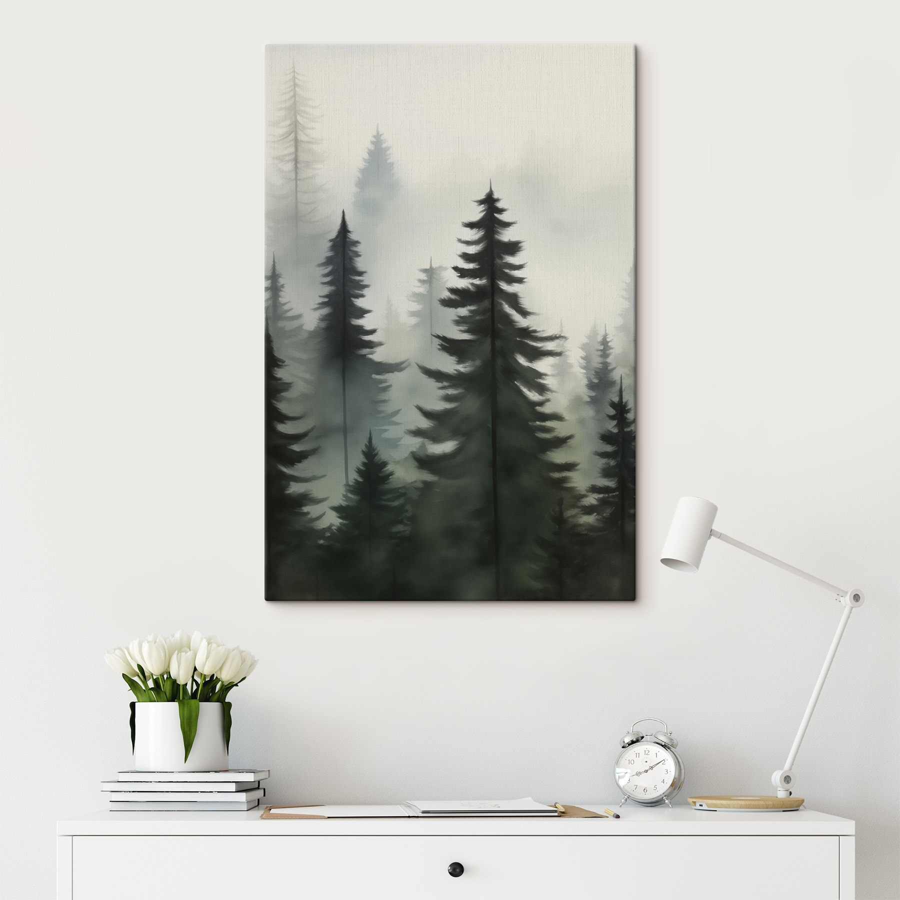Mit diesem bezaubernden Leinwandbild, das eine ruhige Baumgruppe in einem nebligen Wald zeigt, können Sie jeden Raum gestalten. Stellen Sie sich vor, Sie wachen mit dieser beruhigenden Szene auf – die dunklen, hoch aufragenden Kiefern, die sich in den Himmel recken, und der sanfte Dunst, der die Geheimnisse der Natur fast flüstert. Wenn Sie diese Schönheit an Ihre Wand hängen, verleiht sie Ihnen nicht nur Charme, sondern vermittelt auch ein Gefühl der Ruhe, wie ein Hauch von frischer Waldluft. Perfekt für gemütliche Ecken oder um eine entspannende Atmosphäre in einem Büro zu schaffen. Es ist, als hätte man sein eigenes Stückchen Natur, ganz ohne Wanderschuhe!