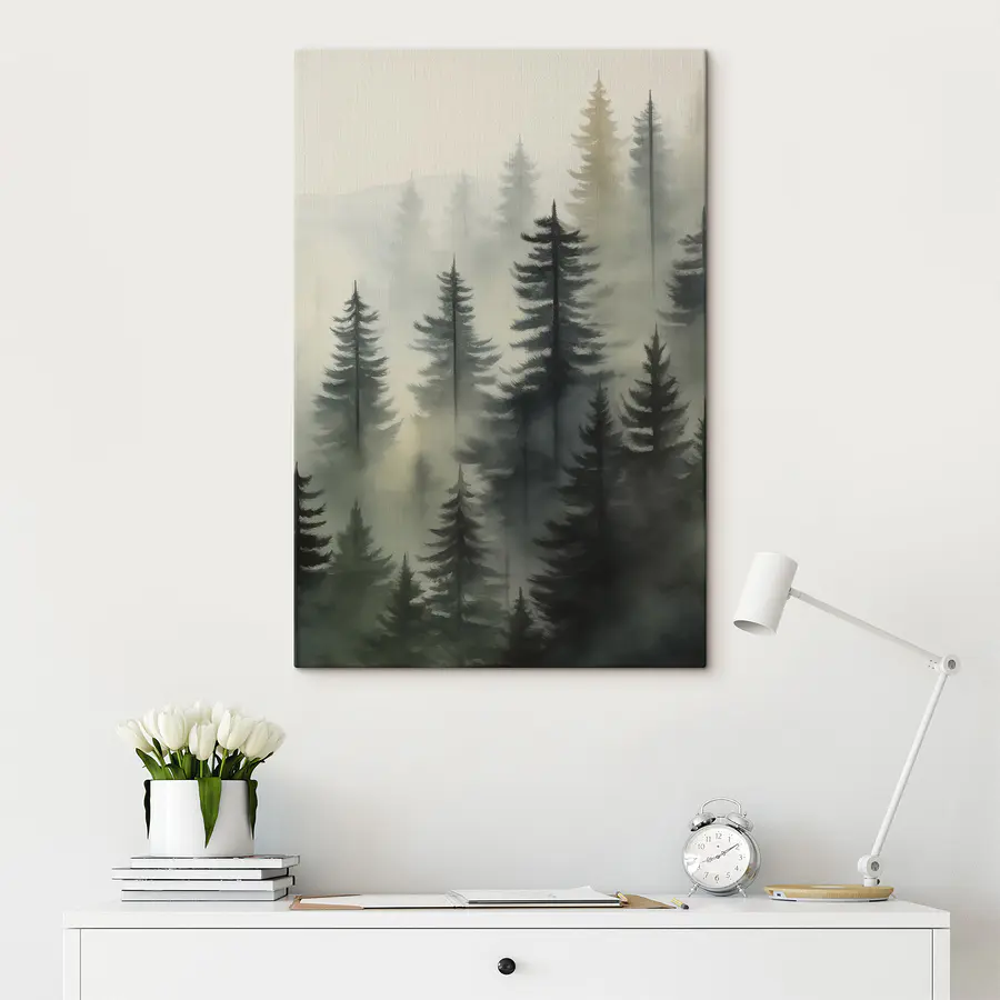 Treten Sie ein in eine Welt, in der neblige Wälder zum Leben erwachen – direkt an Ihrer Wand. Dieser Leinwanddruck eines nebelverhangenen Waldes mit hoch aufragenden Bäumen fängt diese ätherische Stimmung ein – perfekt für gemütliche Abende, an denen man sich mit einem Buch und einem Tee zurückziehen möchte. Stellen Sie sich vor, dass Sie sich inmitten der Bäume verlieren, während der Nebel Sie sanft umhüllt und ein Gefühl der Verwunderung und Ruhe erzeugt. Es ist wie ein geheimes Versteck, das von den Geheimnissen der Natur flüstert. Dieses Stück dekoriert nicht nur, es transportiert! Es passt perfekt in Wohn- oder Schlafzimmer und bringt Wärme und ein Gefühl von Abenteuer in jeden Raum.