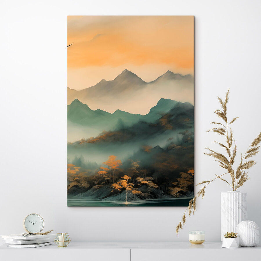 Stellen Sie sich vor, Sie treten in eine Welt ein, in der Nebel eine ruhige Bergkette umhüllt und die Bäume stolz in der Umarmung der Natur stehen. Dieser Leinwanddruck fängt diese Magie wunderschön ein. Die sanften Farbtöne des frühen Morgenlichts schaffen ein beruhigendes Ambiente, das sich perfekt für jeden Wohnraum eignet. Es ist wie ein frischer Wind in Ihrem Zuhause, ein Gesprächsanlass oder einfach ein visueller Rückzugsort nach einem langen Tag. Stellen Sie es sich über einem gemütlichen Sofa oder in einer ruhigen Leseecke vor – jeder Blick fühlt sich an wie eine kleine Flucht in die Berge. Perfekt für alle, die sich nach einem Stückchen Ruhe sehnen.
