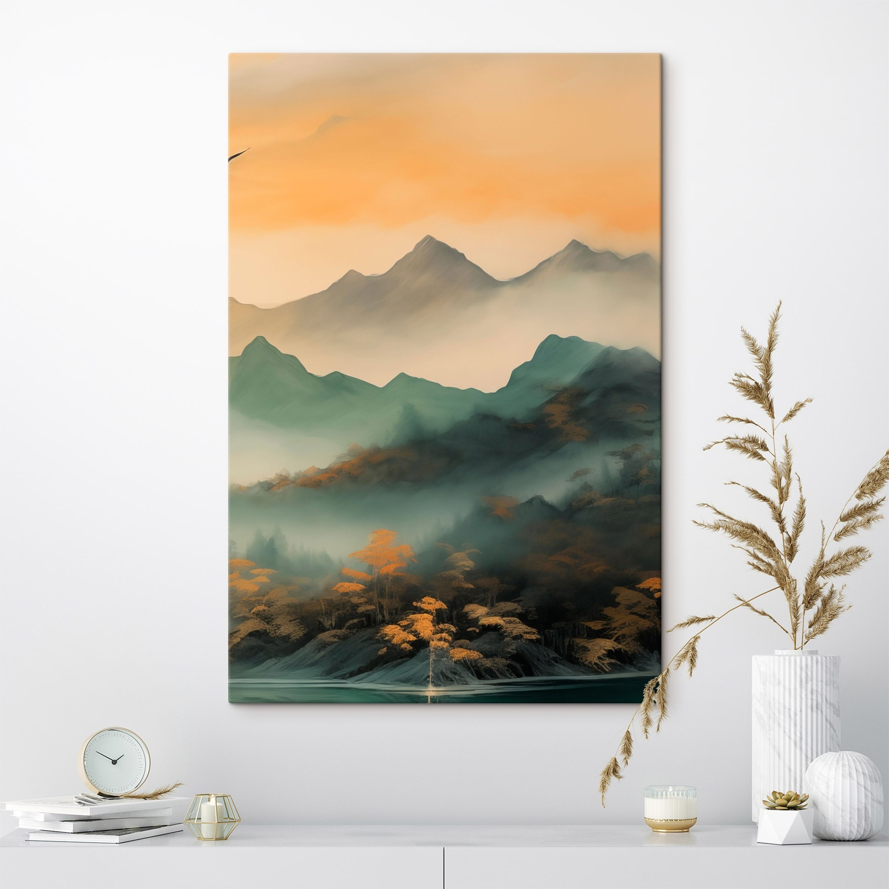 Stellen Sie sich vor, Sie treten in eine Welt ein, in der Nebel eine ruhige Bergkette umhüllt und die Bäume stolz in der Umarmung der Natur stehen. Dieser Leinwanddruck fängt diese Magie wunderschön ein. Die sanften Farbtöne des frühen Morgenlichts schaffen ein beruhigendes Ambiente, das sich perfekt für jeden Wohnraum eignet. Es ist wie ein frischer Wind in Ihrem Zuhause, ein Gesprächsanlass oder einfach ein visueller Rückzugsort nach einem langen Tag. Stellen Sie es sich über einem gemütlichen Sofa oder in einer ruhigen Leseecke vor – jeder Blick fühlt sich an wie eine kleine Flucht in die Berge. Perfekt für alle, die sich nach einem Stückchen Ruhe sehnen.