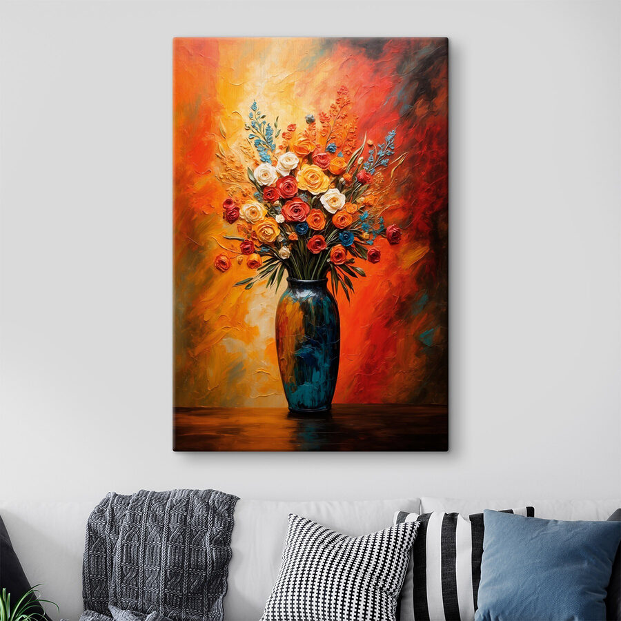 Dieser lebendige Leinwanddruck mit einem atemberaubenden Blumenstrauß in einer wunderschön gestalteten Vase verwandelt jeden Raum. Die satten Farben – leuchtende Rottöne, sonnige Gelbtöne und kühles Grün – bringen eine fröhliche Explosion der Natur direkt in Ihr Zuhause. Stellen Sie sich vor, Sie wachen auf und werden von diesem fröhlichen Farbklecks begrüßt, der Ihre Stimmung sofort aufhellt. Es ist, als hätte man einen kleinen Garten, der nie verwelkt, perfekt für die grauen Tage, an denen man ein wenig Sonne braucht. Überlassen Sie den Blumen das Reden und verleihen Sie Ihrem Raum einen Hauch von Wärme. Sie werden mit Sicherheit für Gesprächsstoff sorgen!