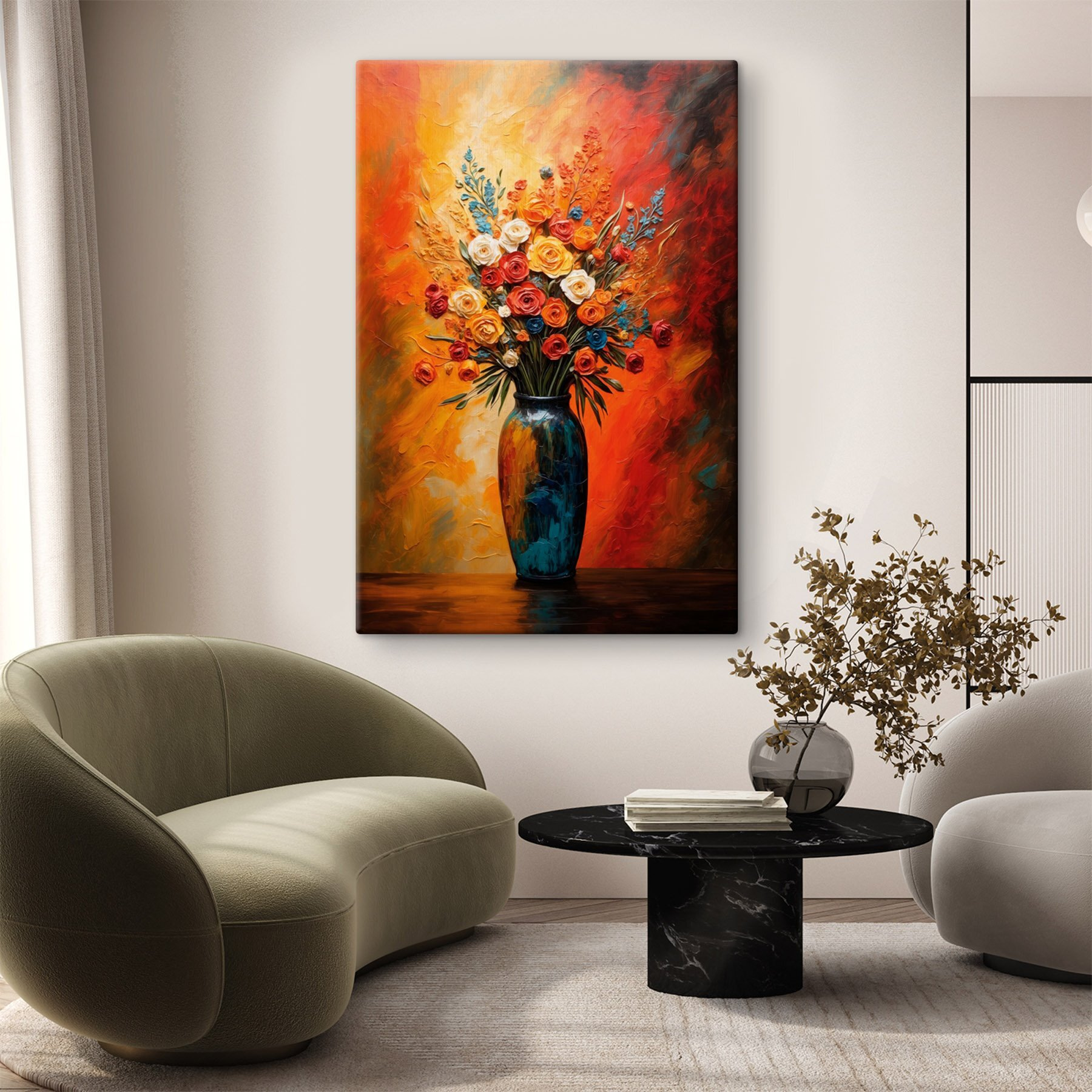 Dieser lebendige Leinwanddruck mit einem atemberaubenden Blumenstrauß in einer wunderschön gestalteten Vase verwandelt jeden Raum. Die satten Farben – leuchtende Rottöne, sonnige Gelbtöne und kühles Grün – bringen eine fröhliche Explosion der Natur direkt in Ihr Zuhause. Stellen Sie sich vor, Sie wachen auf und werden von diesem fröhlichen Farbklecks begrüßt, der Ihre Stimmung sofort aufhellt. Es ist, als hätte man einen kleinen Garten, der nie verwelkt, perfekt für die grauen Tage, an denen man ein wenig Sonne braucht. Überlassen Sie den Blumen das Reden und verleihen Sie Ihrem Raum einen Hauch von Wärme. Sie werden mit Sicherheit für Gesprächsstoff sorgen!