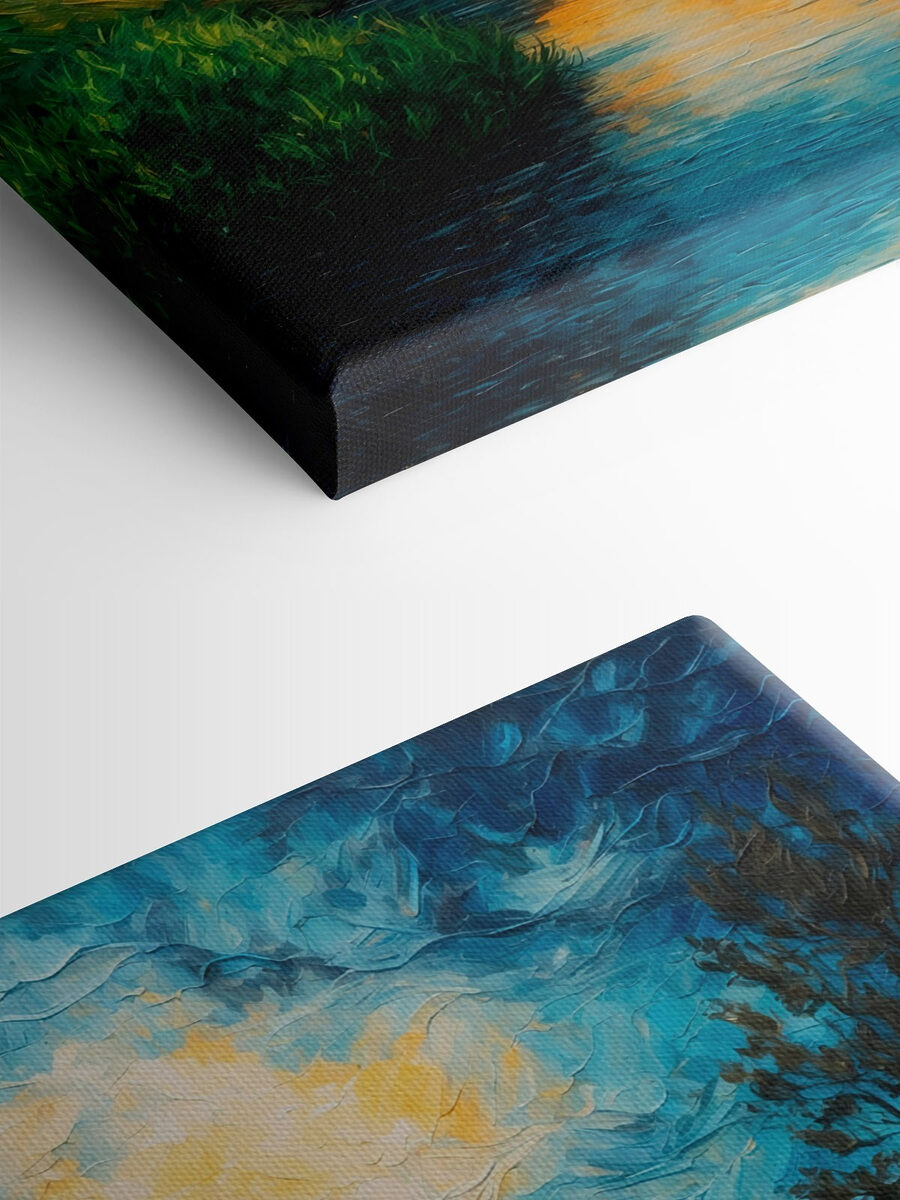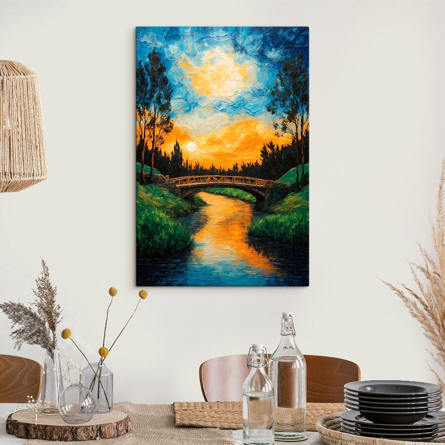 Verwandeln Sie jeden Raum in einen ruhigen Zufluchtsort mit diesem atemberaubenden Leinwanddruck “Bridge over a River”. Stellen Sie sich einen ruhigen Abend vor, an dem der Sonnenuntergang den Himmel in warme Farben taucht und das Wasser das farbenfrohe Spektakel reflektiert. Die sanft geschwungene Brücke lädt zum Träumen von gemütlichen Spaziergängen oder ruhigen Momenten ein, in denen man einfach nur alles auf sich wirken lässt. Dieses Stück verleiht der Natur einen Hauch von Eleganz und erinnert Sie daran, tief durchzuatmen und zu entspannen. Es ist, als ob man sich ein Stückchen Natur ins Haus holt – perfekt für eine gemütliche Leseecke oder zur Aufhellung einer leeren Wand. Naturliebhaber und Dekorationsenthusiasten werden es zu schätzen wissen, dass es sich nahtlos in jeden Stil einfügt und Freude und Gedanken auslöst.