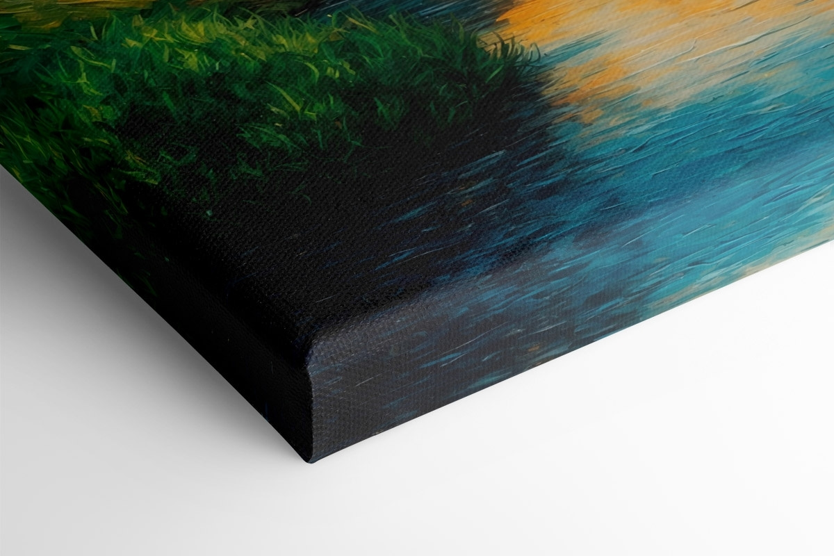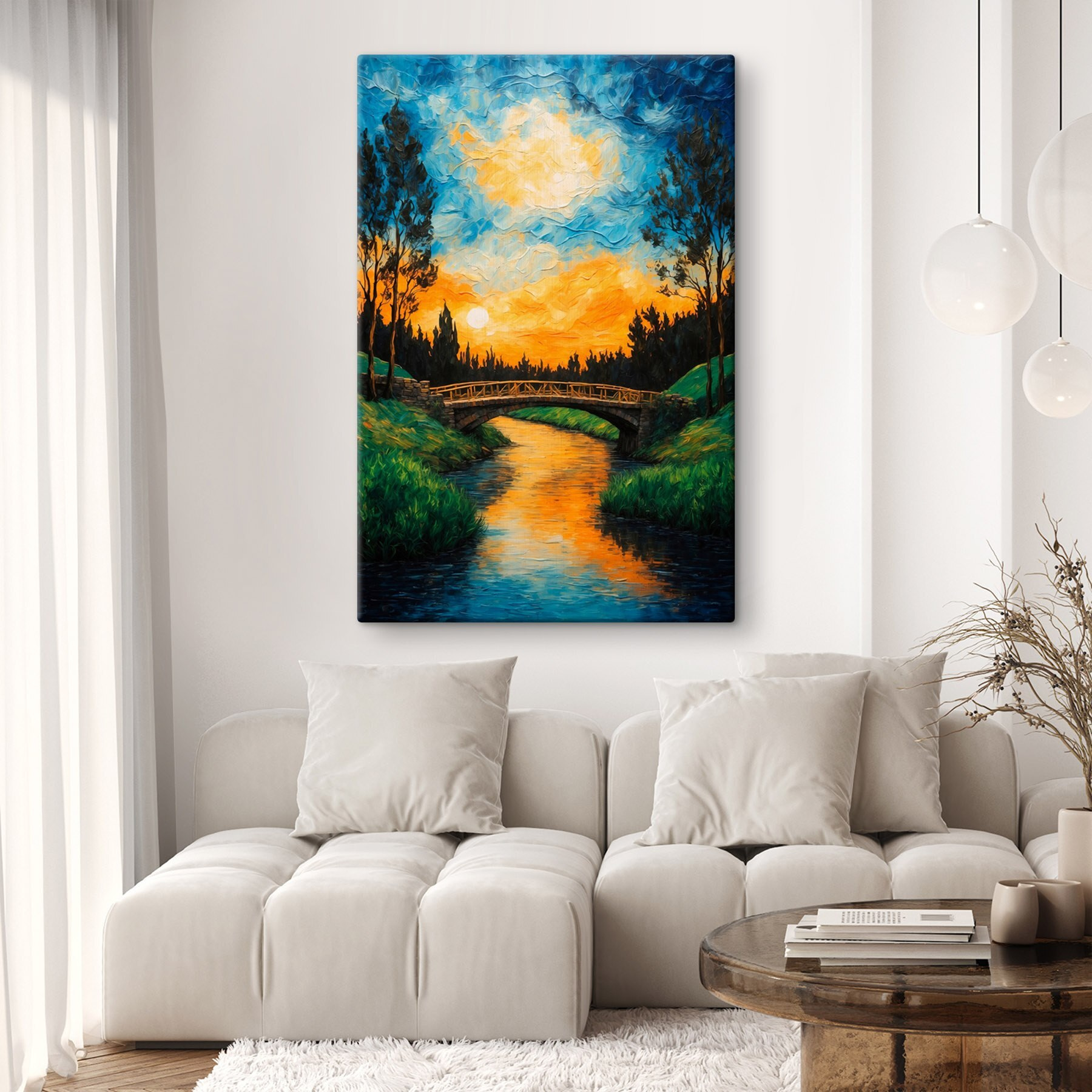 Verwandeln Sie jeden Raum in einen ruhigen Zufluchtsort mit diesem atemberaubenden Leinwanddruck “Bridge over a River”. Stellen Sie sich einen ruhigen Abend vor, an dem der Sonnenuntergang den Himmel in warme Farben taucht und das Wasser das farbenfrohe Spektakel reflektiert. Die sanft geschwungene Brücke lädt zum Träumen von gemütlichen Spaziergängen oder ruhigen Momenten ein, in denen man einfach nur alles auf sich wirken lässt. Dieses Stück verleiht der Natur einen Hauch von Eleganz und erinnert Sie daran, tief durchzuatmen und zu entspannen. Es ist, als ob man sich ein Stückchen Natur ins Haus holt – perfekt für eine gemütliche Leseecke oder zur Aufhellung einer leeren Wand. Naturliebhaber und Dekorationsenthusiasten werden es zu schätzen wissen, dass es sich nahtlos in jeden Stil einfügt und Freude und Gedanken auslöst.