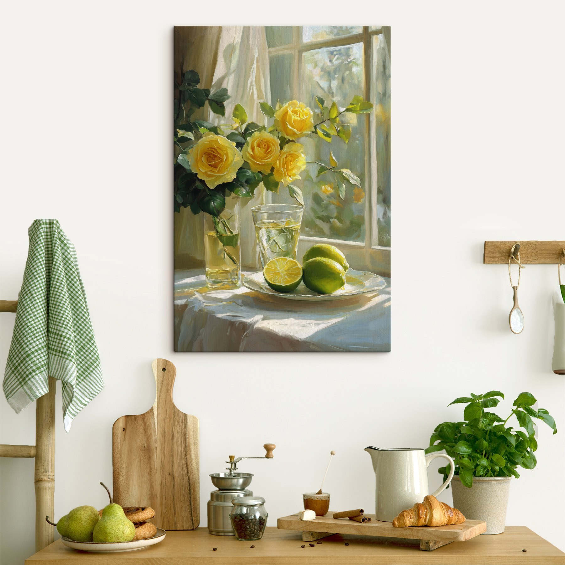 Dieses entzückende Bild mit gelben Rosen und pikanten Zitronen, die sich auf einem Teller räkeln, bringt jeden Raum zum Strahlen. Es ist wie ein sonniger Nachmittag, der an der Wand festgehalten wird! Stellen Sie sich vor, dass Sie beim Vorbeigehen einen Blick auf diese fröhlichen Blüten erhaschen – ihr sanfter Duft weht fast durch die Luft und lässt Sie sich ein wenig leichter fühlen. Die leuchtenden Gelbtöne und das frische Grün bringen Farbe in jeden Raum. Perfekt für die Küche oder den Essbereich ist sie eine freundliche Erinnerung an einfache Freuden – frische Blumen, erfrischende Getränke und die kleinen Momente, die das Leben süß machen. Wer wünscht sich nicht ein bisschen mehr Sonnenschein in seinem Tag?