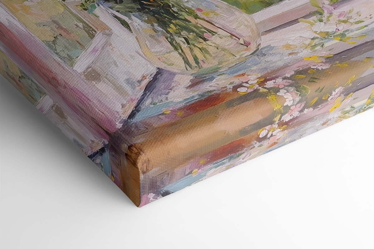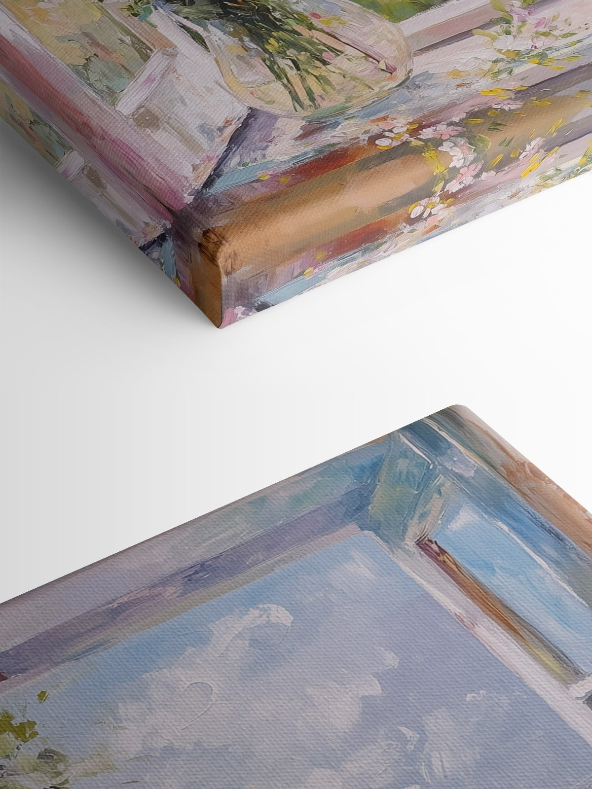Stellen Sie sich vor, Sie wachen an einem sonnigen Morgen auf und dieses hübsche Leinwandbild begrüßt Sie. Es ist, als ob Sie ein Stück Natur in Ihr gemütliches Zimmer einladen würden. Das weit geöffnete Fenster offenbart einen Strauß lebendiger Blumen, die die Sonne genießen, während sich dahinter eine üppige Wiese ausbreitet. Dieses Stück verleiht jedem Raum mühelos Charme und Wärme und lässt ihn noch lebendiger wirken. Stellen Sie es sich in einem malerischen Café oder in einem sonnigen Büro vor – Ihre Gäste werden garantiert stehen bleiben und es bewundern. Es ist die Art von Kunst, die flüstert: “Entspann dich, du bist jetzt zu Hause”. Perfekt, um zu träumen oder einfach einen Moment zu genießen!