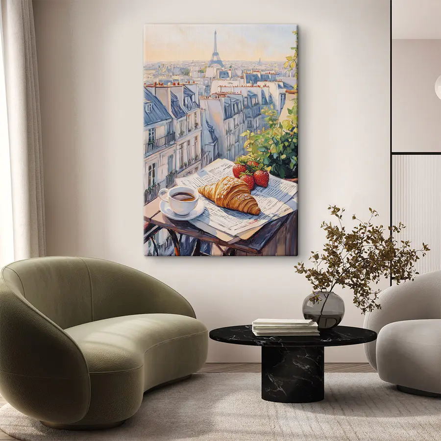 Stellen Sie sich vor, Sie beginnen Ihren Tag mit einer Aussicht, die Ihnen den Atem raubt. Dieser Leinwanddruck zeigt eine gemütliche Frühstücksszene, in der eine dampfende Tasse Kaffee neben einem flockigen Croissant und saftigen Erdbeeren steht, eingerahmt von den charmanten Dächern von Paris. Es ist, als würde man auf einen sonnenverwöhnten Balkon entführt, auf dem das geschäftige Treiben der Stadt verblasst. Die sanften Farben und die einladende Atmosphäre laden zum Träumen ein – wer würde nicht gerne einen Kaffee schlürfen, während er sich in dieser ruhigen Atmosphäre entspannt? Perfekt für die Küche oder den Essbereich, bringt dieses Stück Wärme und einen Hauch von Fernweh in jeden Raum. Holen Sie sich ein Stück von diesem Zauber und lassen Sie Ihre Wände eine Geschichte erzählen!
