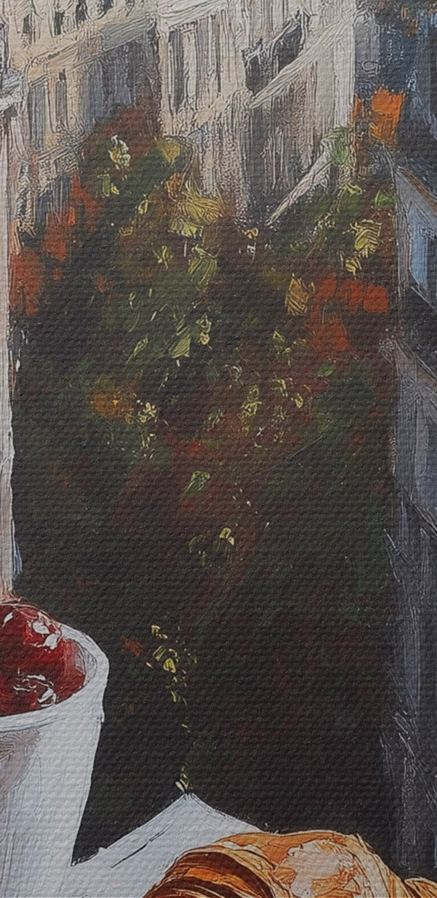 Stellen Sie sich vor, Sie wachen mit dieser gemütlichen Szene direkt an Ihrer Wand auf. Eine Tasse dampfenden Kaffees steht neben perfekt gebackenen Croissants, umrahmt von einer atemberaubenden Stadtansicht. Dieser Leinwanddruck ist wie eine sanfte Einladung zur Entschleunigung – schlürfen Sie den Kaffee, genießen Sie das Gebäck, und lassen Sie die Sorgen des Tages hinter sich. Es eignet sich perfekt für die Küche oder den Essbereich und versprüht einen Hauch von europäischem Charme, der jedes Frühstück zu etwas ganz Besonderem macht. Es ist, als wäre man auf einem Balkon in Paris, nur ohne den Jetlag. Wer würde sich das nicht wünschen?