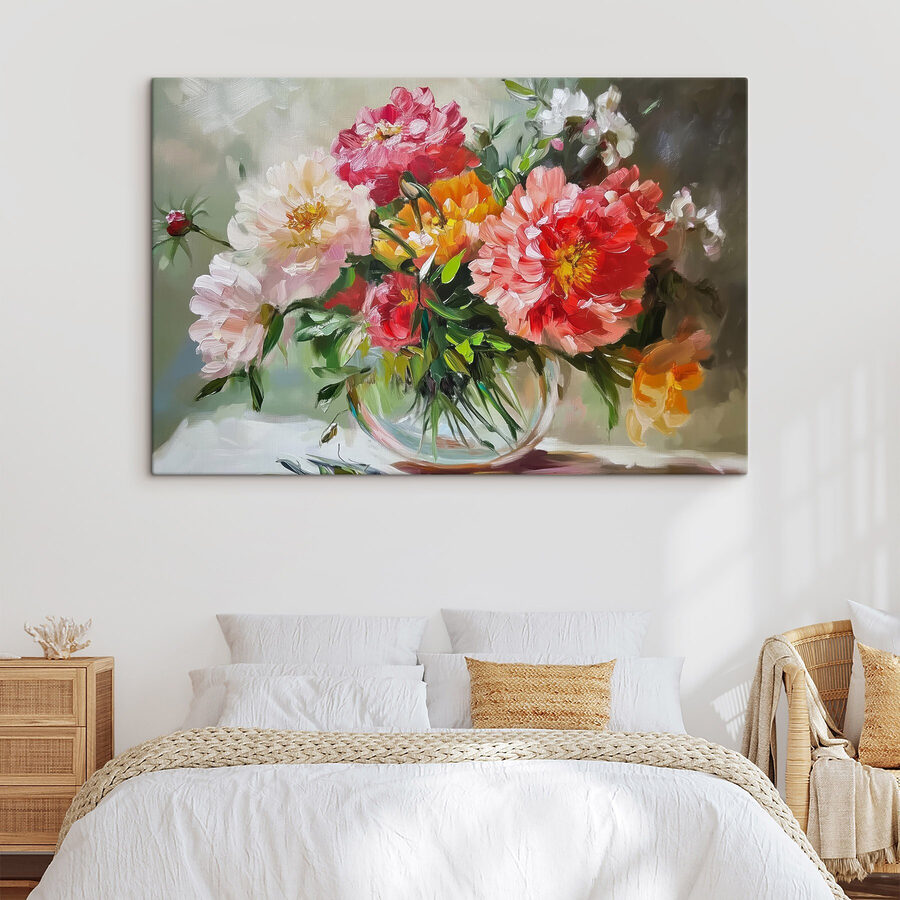 Dieser atemberaubende Leinwanddruck mit Blumen in einer Vase bringt jeden Raum zum Strahlen! Stellen Sie sich vor, wie diese leuchtenden Blüten direkt an Ihrer Wand zum Leben erwachen – ein perfekter Muntermacher für trübe Tage oder eine fröhliche Ergänzung für lebhafte Zusammenkünfte. Jedes Blütenblatt scheint vor Farbe zu tanzen, so dass es sich selbst im tiefsten Winter wie Frühling anfühlt. Es ist die Art von Stück, die ins Auge fällt und die Gäste zu Komplimenten einlädt. Stellen Sie sich gemütliche Abende zu Hause vor, an denen Sie an einem Tee nippen und sich an diesem schönen Stück Natur erfreuen. Perfekt für alle, die einen Hauch von Schönheit in ihrem Leben lieben!