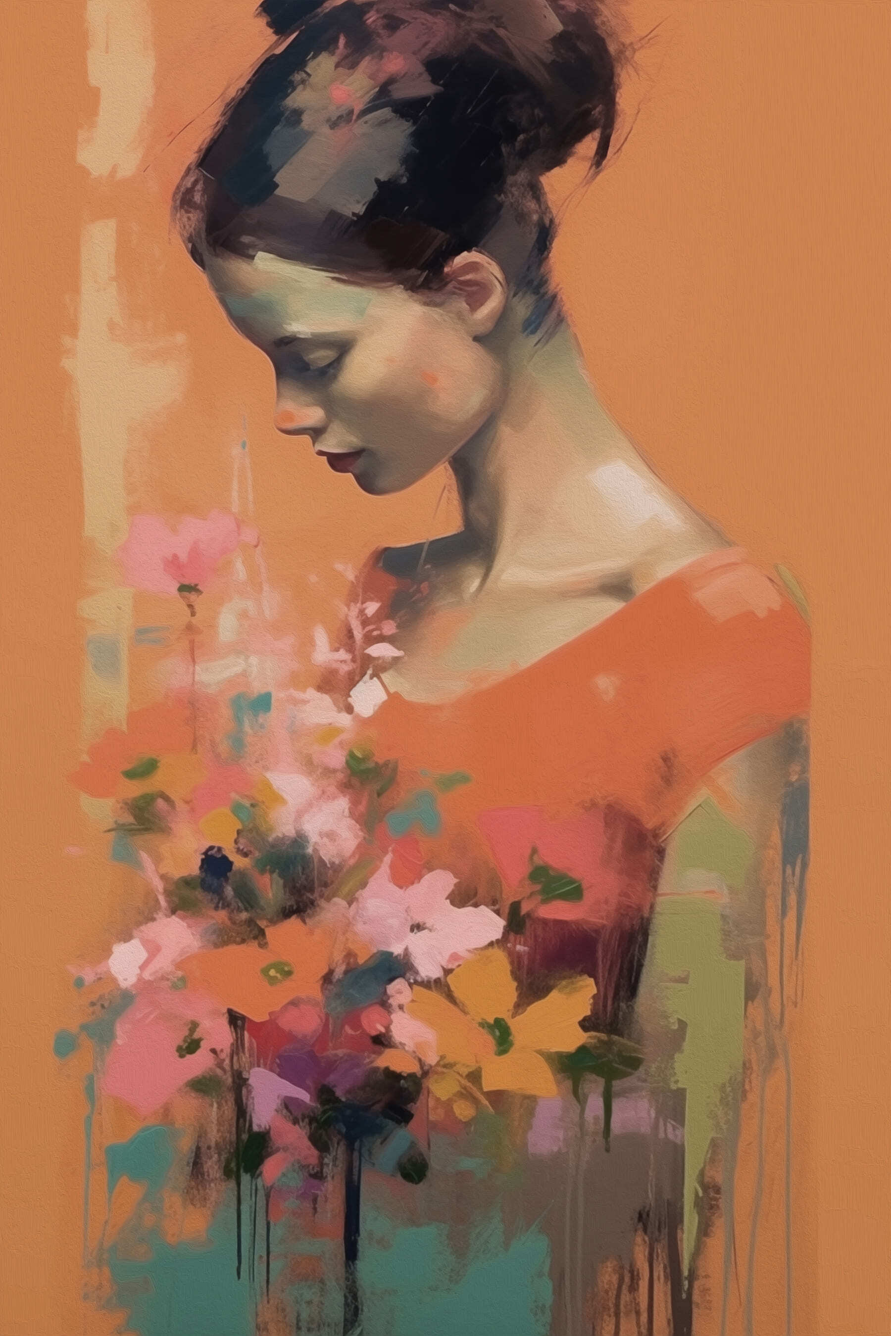 Dieses bezaubernde Leinwandbild zeigt eine Frau, die zart einen Blumenstrauß in der Hand hält, und strahlt eine heitere und fröhliche Stimmung aus. Die warmen Farben rufen ein Gefühl der Ruhe hervor und machen es zu einem perfekten Ort für Tagträume. Stellen Sie sich vor, Sie betreten einen Raum und werden von diesem schönen Stück begrüßt, das den Raum sofort verwandelt. Es ist wie eine sanfte Erinnerung daran, innezuhalten und an den Blumen zu riechen, und sei es nur im Geiste. Dieses Kunstwerk ist ideal für eine gemütliche Ecke oder eine trendige Galeriewand und bringt überall Freude ins Spiel. Es wird sicherlich Gäste zum Lächeln bringen und Gespräche anregen.