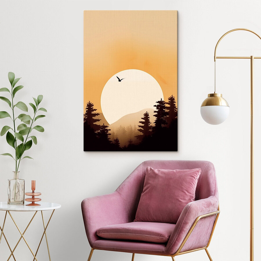 Stellen Sie sich einen heiteren Morgen vor, an dem ein einzelner Vogel anmutig vor einem sanften, sonnenbeschienenen Himmel dahingleitet. Dieser Leinwanddruck fängt genau diesen Moment ein und bringt einen Hauch des Friedens der Natur in jeden Raum. Die Silhouetten der hoch aufragenden Bäume, die die Szene umrahmen, sind wie ein sanftes Flüstern des Waldes, das Ruhe in Ihr hektisches Leben bringt. Stellen Sie sich vor, es in Ihrem Wohnzimmer aufzuhängen, und jeder Blick wird zu einer kleinen Flucht – eine Erinnerung daran, durchzuatmen, sich zu entspannen und vielleicht sogar darüber nachzudenken, welche Abenteuer draußen auf einen warten. Dieses Stück dekoriert nicht nur, es inspiriert auch. Es eignet sich perfekt für gemütliche Ecken oder Wände, die ein wenig Leben brauchen, und wird Sie sicher jedes Mal zum Lächeln bringen, wenn Sie daran vorbeigehen.