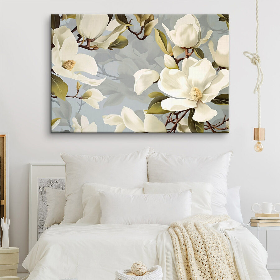 Verwandeln Sie Ihren Raum mit diesem atemberaubenden Leinwanddruck, der elegante weiße Blüten in sanften, beruhigenden Farbtönen zeigt. Es ist wie ein Hauch von Frühling das ganze Jahr über – perfekt für die Momente, in denen Sie sich in Ihren eigenen kleinen Garten zurückziehen möchten. Stellen Sie sich vor, wie Sie im sanften Schein dieser zarten Blüten an Ihrem Kaffee nippen und dabei ein Gefühl der Ruhe verspüren. Sie passt wunderbar in jeden Raum, vom gemütlichen Wohnzimmer bis zum friedlichen Schlafzimmer. Die lieblichen Farben können selbst die hektischsten Tage besänftigen und machen jeden Blick zu einer reizvollen kleinen Erinnerung daran, die Schönheit zu umarmen, wo immer sie zu finden ist. Verleihen Sie Ihren Wänden einen Hauch von floralem Charme und lassen Sie sie erblühen!
