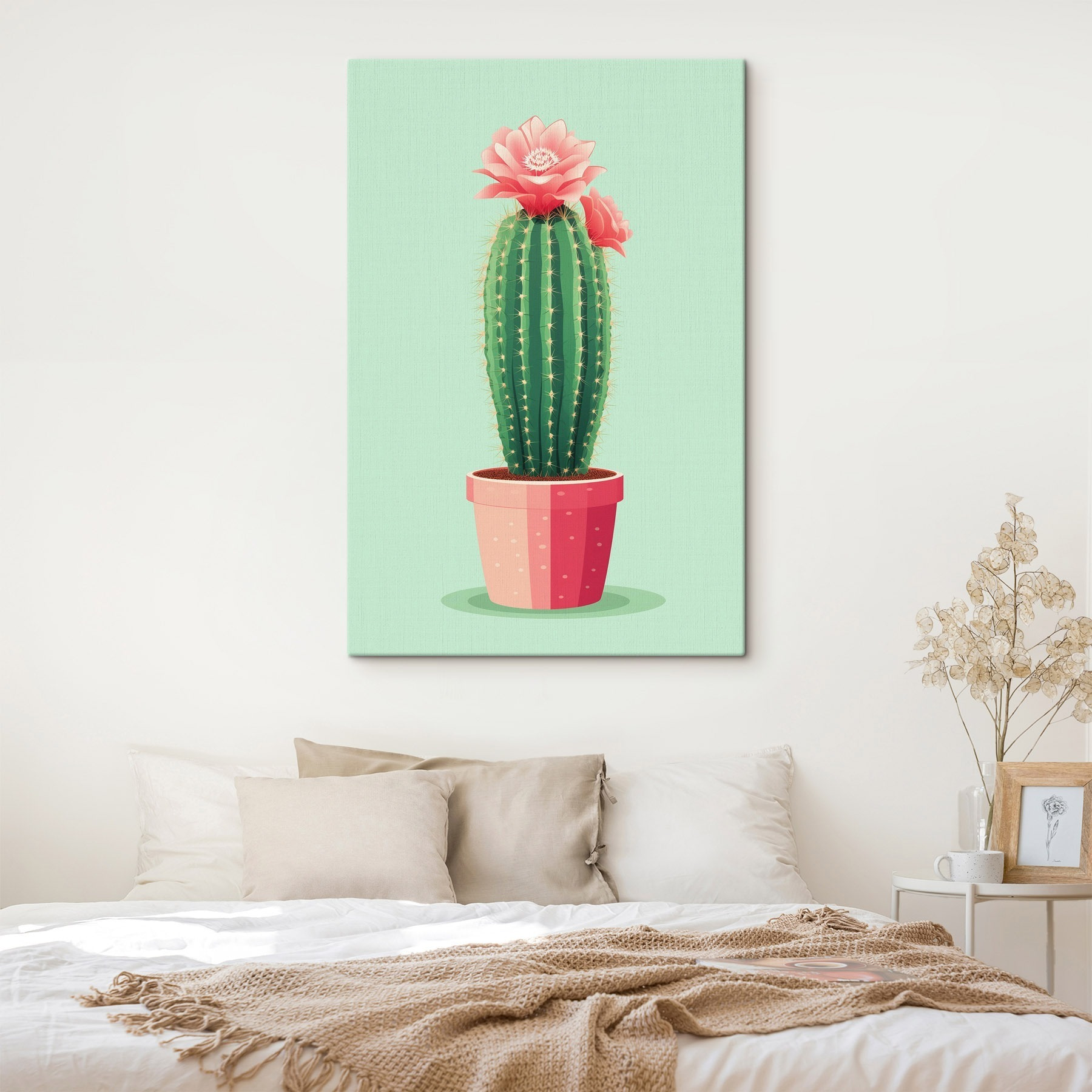 Mit diesem fröhlichen Leinwandbild mit einem blühenden Kaktus bringen Sie Leben in jeden Raum. Stellen Sie sich vor: ein großer, stacheliger grüner Freund mit leuchtend rosa Blüten, der die Sonne genießt und gute Laune verbreitet. Es ist wie ein Stück Magie der Natur direkt an Ihrer Wand. Ob in einer gemütlichen Küche oder in einem trendigen Wohnzimmer, dieses Kunstwerk lädt zum Lächeln und zu einem Hauch von Wärme ein. Wer hätte nicht gern einen Gesprächsanlass, der sagt: “Ja, ich bin entzückend und ein bisschen einzigartig”? Perfekt für Naturliebhaber oder alle, die ihren Raum auf mühelose und lustige Weise verschönern wollen!