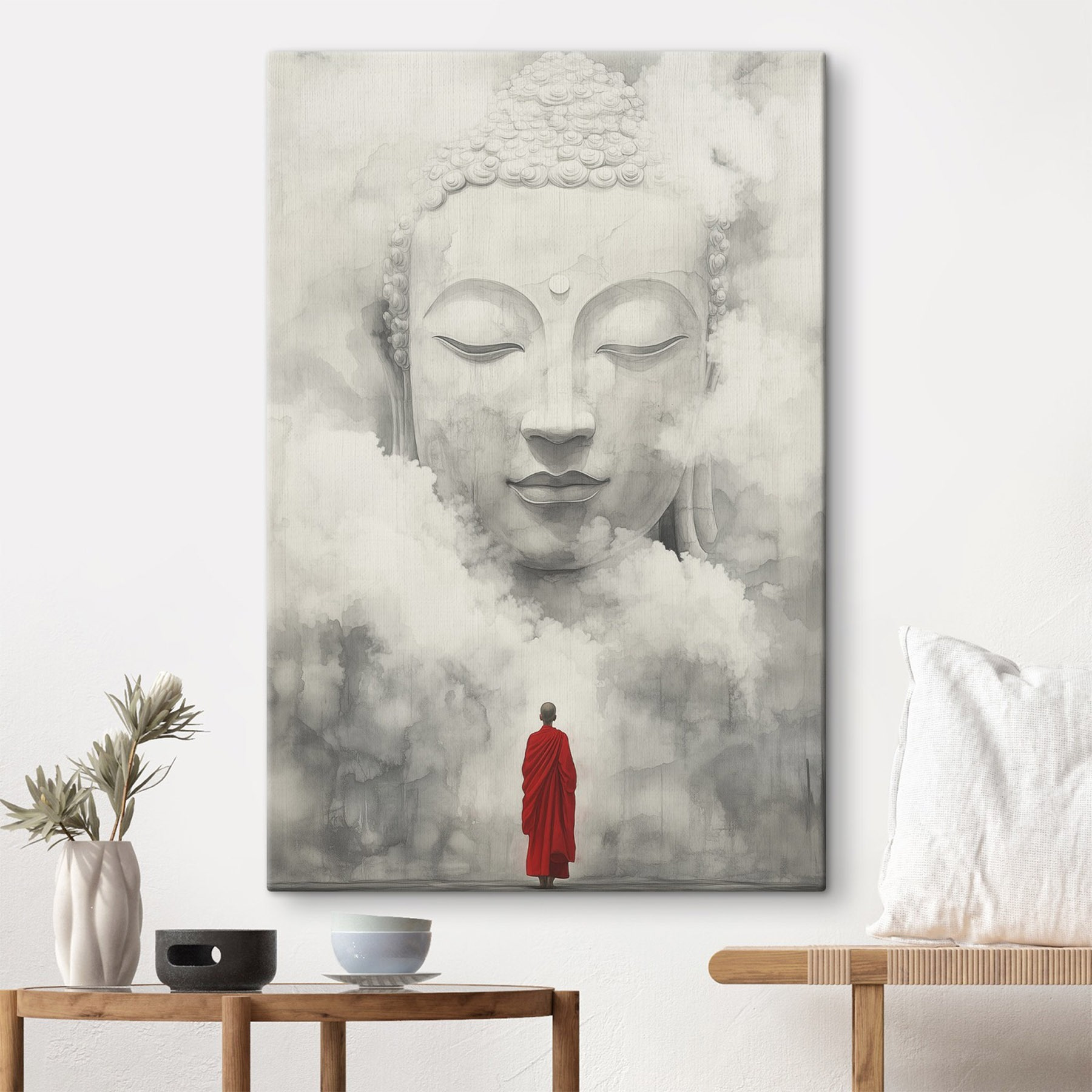 Betreten Sie mit diesem atemberaubenden Leinwanddruck eine Szene, die fast wie aus einer anderen Welt wirkt. Ein in leuchtendes Rot gekleideter Mönch steht vor einer riesigen Statue, die in sanfte Wolken getaucht ist, die alte Geheimnisse zu flüstern scheinen. Es ist nicht nur Kunst, sondern auch eine Einladung zum Durchatmen, zum Nachdenken und vielleicht sogar zum Finden von ein wenig Frieden inmitten des Chaos des Lebens. Stellen Sie sich vor, es hängt an Ihrer Wand – eine tägliche Erinnerung daran, innezuhalten und den Moment zu genießen. Freunde könnten vorbeikommen und sich in der Gelassenheit verlieren, Geschichten erzählen oder einfach nur staunen. Dieses Werk trifft den Nerv der Zeit, nicht wahr? Ideal für diejenigen, die Kunst mit tieferer Bedeutung schätzen. Perfekt für Wohnzimmer, Meditationsräume oder überall dort, wo man einen Hauch von Seele braucht.