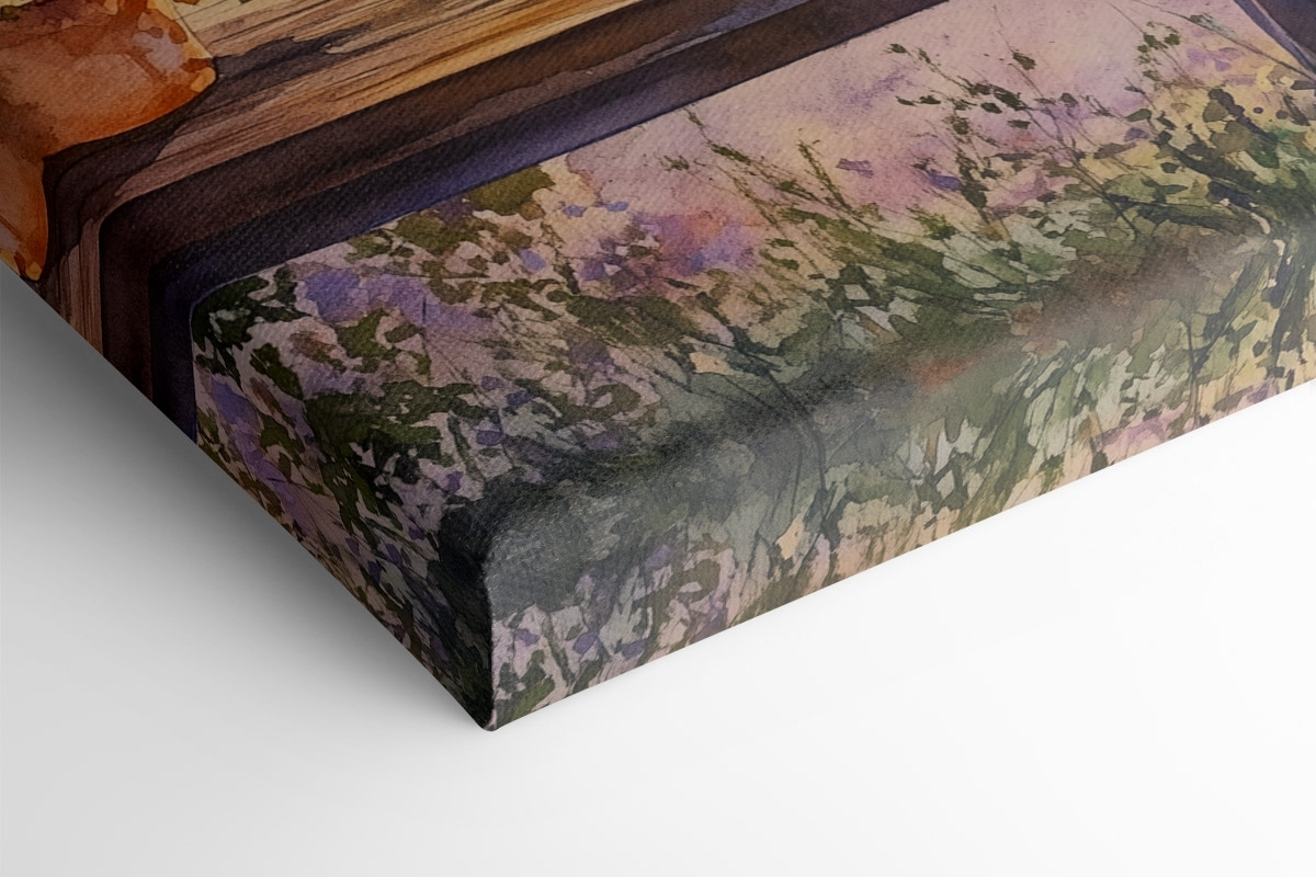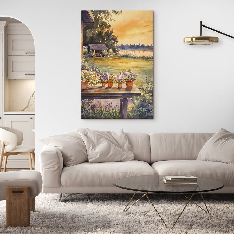 Verwandeln Sie eine Wand in einen einladenden Zufluchtsort mit diesem bezaubernden Aquarelldruck einer Veranda, die mit lebhaften Topfblumen geschmückt ist. Stellen Sie sich das vor: ein sanfter Sonnenuntergang, der warme Farbtöne wirft, während Sie an Ihrem Lieblingsgetränk nippen und die sanfte Brise spüren. Die lebendigen Farben der Blumen rufen ein Lächeln hervor und regen zu Gesprächen an, was es zu einer schönen Ergänzung für gemütliche Ecken oder zur Aufhellung einer weniger aufregenden Ecke macht. Stellen Sie sich vor, wie Ihre Gäste vorbeischlendern, diese heitere Szene bewundern und sich in Gedanken an warme Sommerabende verlieren. Es ist nicht nur Dekoration, es ist ein kleines Stück Glückseligkeit.