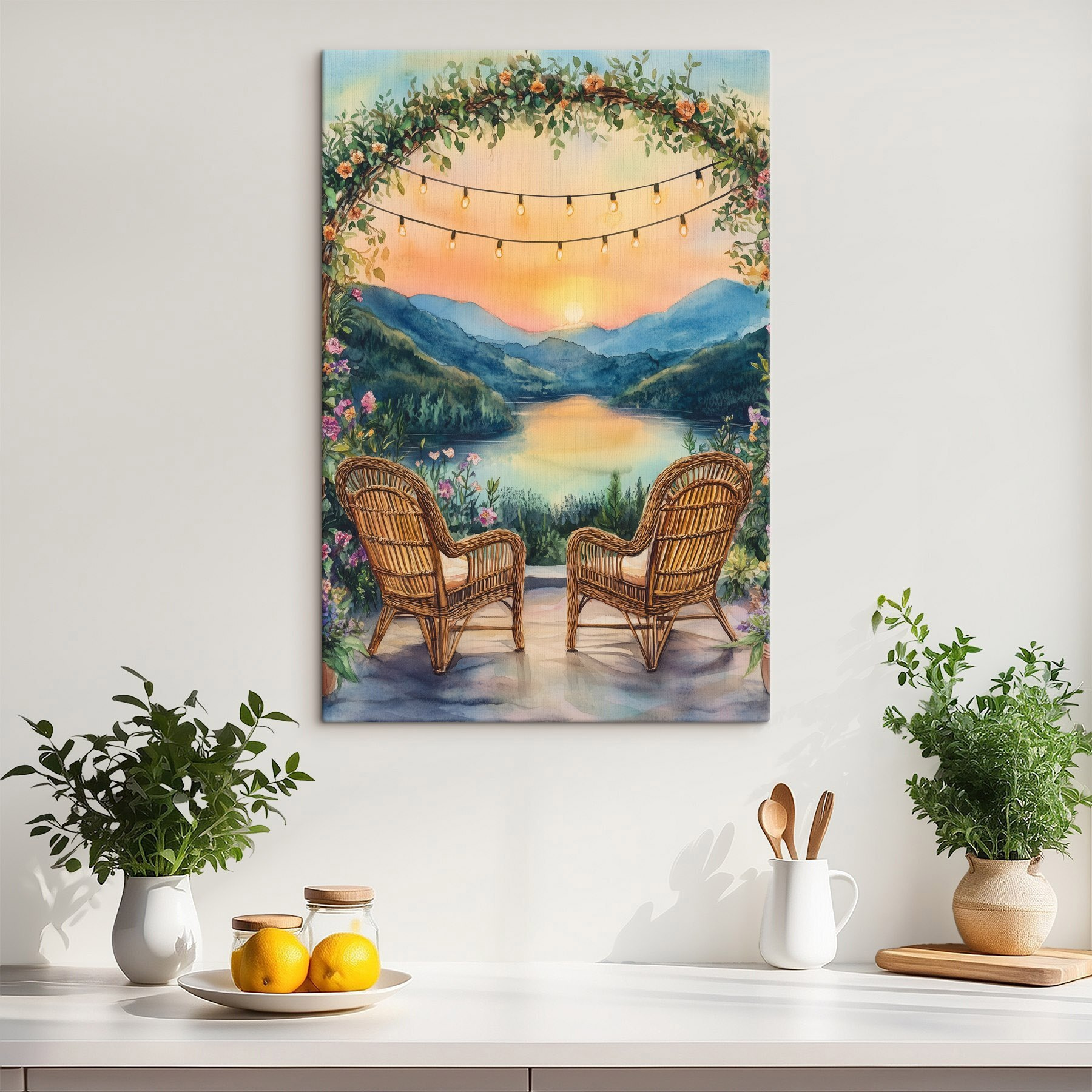 Stellen Sie sich vor, wie Sie es sich in diesen gemütlichen Stühlen bequem machen, umgeben von funkelnden Lichtern und Blüten. Dieser schöne Leinwanddruck fängt diesen traumhaften Moment ein, wenn der Sonnenuntergang den See küsst – eine perfekte Mischung aus Ruhe und Wärme. Die sanften Farbtöne laden zum Entspannen ein, vielleicht mit einer Tasse Tee oder einem guten Buch in der Hand. Es ist, als würde man sich einen friedlichen Urlaub direkt ins Wohnzimmer holen. Stellen Sie es sich über einem Kaminsims oder an einer gemütlichen Wand vor, wo es zu Gesprächen und Tagträumen anregt. Dieses Stück erhellt nicht nur den Raum, sondern hüllt Sie auch in ein kleines Stückchen Ruhe ein, das Sie bei jedem Blick an die Magie der Natur erinnert.