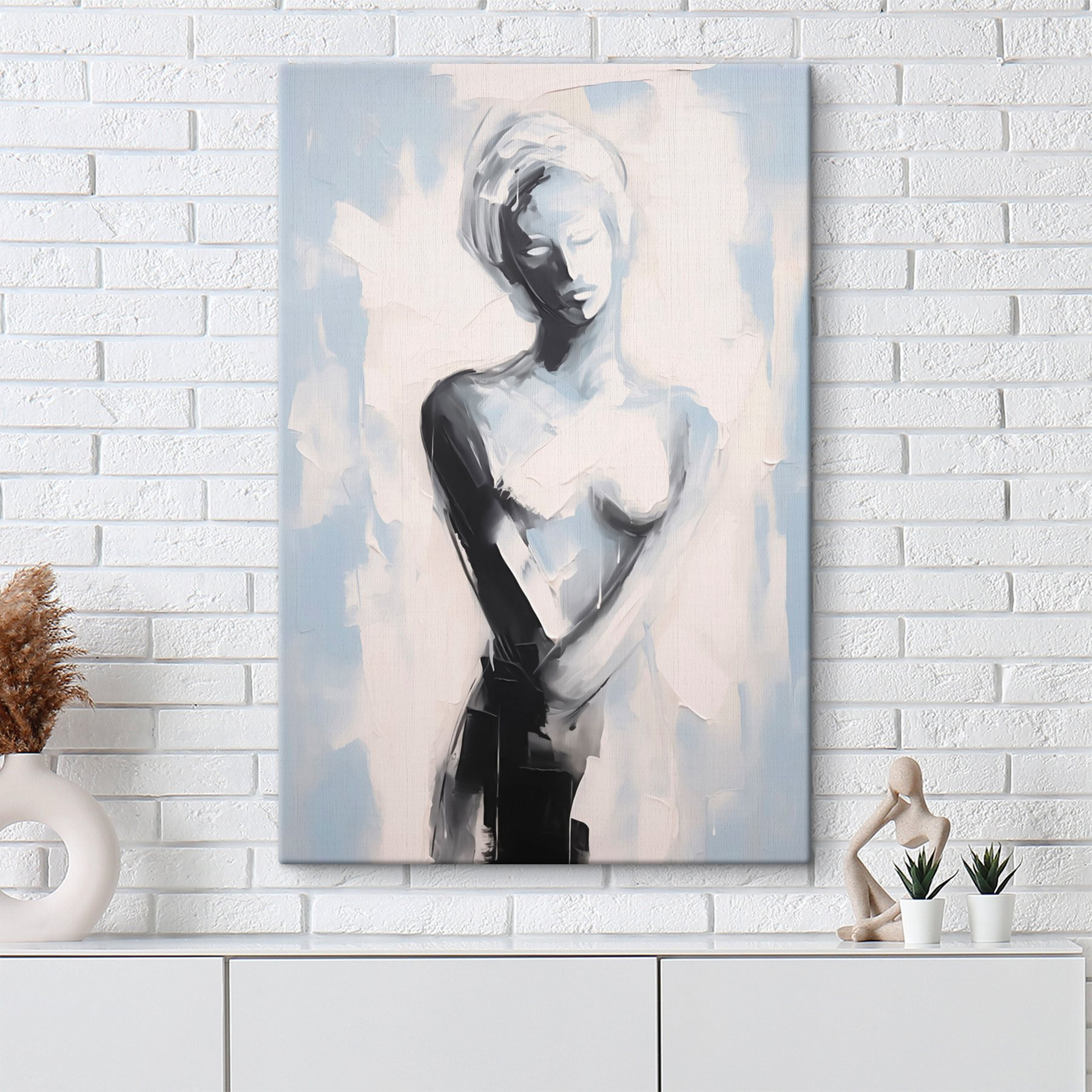 Tauchen Sie ein in eine Welt des minimalistischen Charmes mit diesem fesselnden Leinwanddruck. Stellen Sie sich einen ruhigen Raum vor, in dem die zarte Form einer Frau wunderschön wiedergegeben ist und zu ruhigen Momenten der Reflexion einlädt. Die sanften Blautöne und die kräftigen Kontraste erzeugen einen visuellen Tanz und machen dieses Bild zu einem atemberaubenden Gesprächsanlass. Stellen Sie es sich über einer gemütlichen Couch oder in einer ruhigen Leseecke vor, wo es zu allerlei reizvollen Tagträumen anregt. Es ist nicht nur Kunst, es ist ein Gefühl, eine Erfahrung. Perfekt für alle, die Einzigartigkeit in ihrer Einrichtung schätzen und sich nach einem Hauch von friedlicher Eleganz in ihrem Leben sehnen.