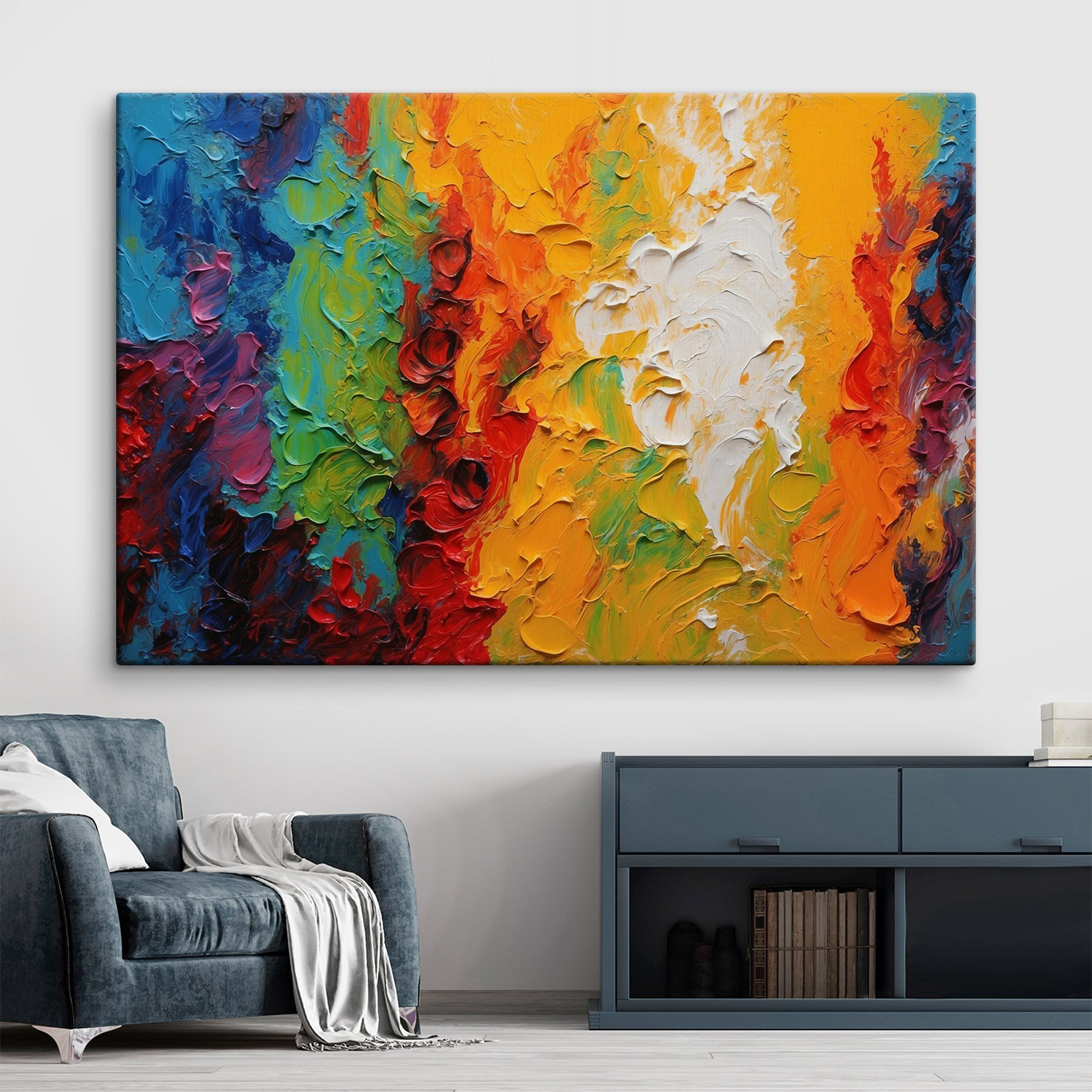 Mit diesem farbenfrohen Leinwandbild können Sie jeden Raum aufpeppen. Dieses farbenfrohe Bild ist wie eine fröhliche Tanzparty für Ihre Wände! Stellen Sie sich vor, Sie betreten Ihren Raum und werden von kräftigen Rottönen, fröhlichen Gelbtönen und beruhigenden Blautönen begrüßt. Dieses Kunstwerk hängt nicht einfach nur da – es lädt zu Gesprächen ein, regt die Kreativität an und macht jeden Tag zu etwas Besonderem. Perfekt für Wohnzimmer, Kunstecken oder wo auch immer etwas Pep gebraucht wird. Es ist wie ein Spritzer Sonnenschein an einem bewölkten Tag – garantiert ein Lächeln und vielleicht sogar das eine oder andere Schmunzeln.